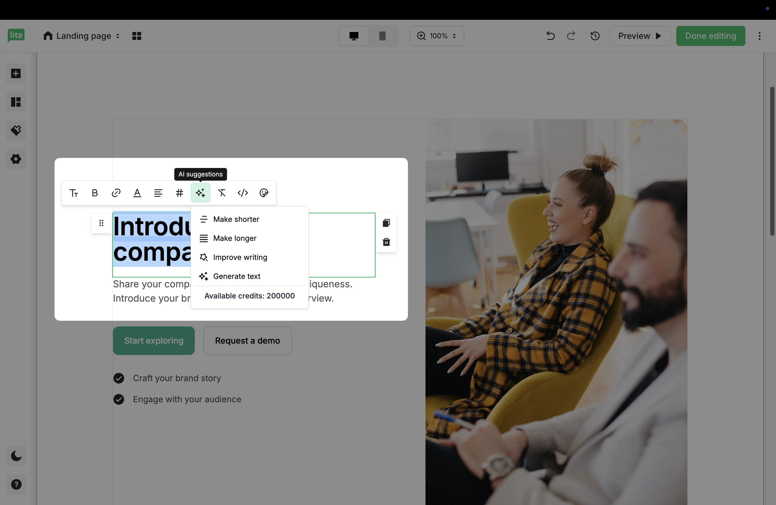Your AI writing assistant is built directly into the Drag & drop editor for campaigns, landing pages, and pop-up forms, making it easy to use with any snippet of text in your email.