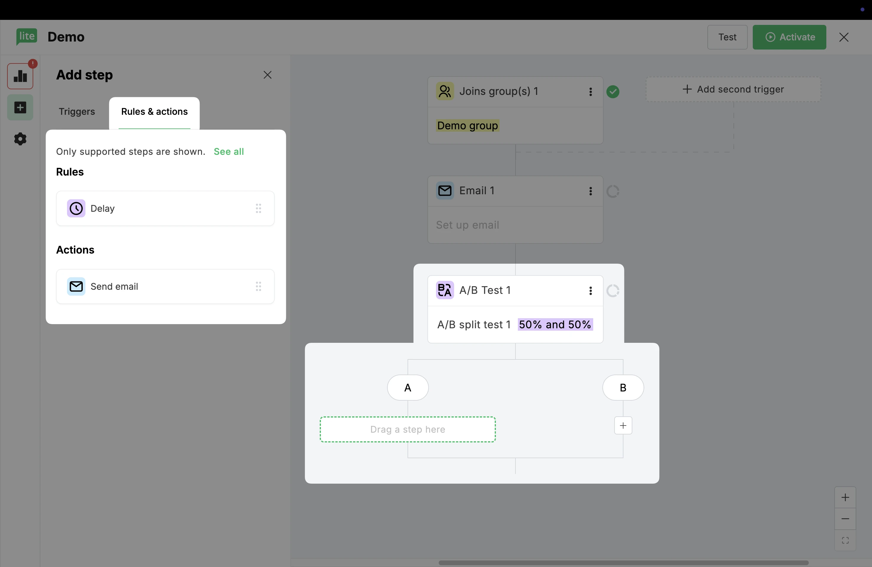 2. Click the + icon and drag and drop the A/B test step from the left side panel into an available space in your automation.