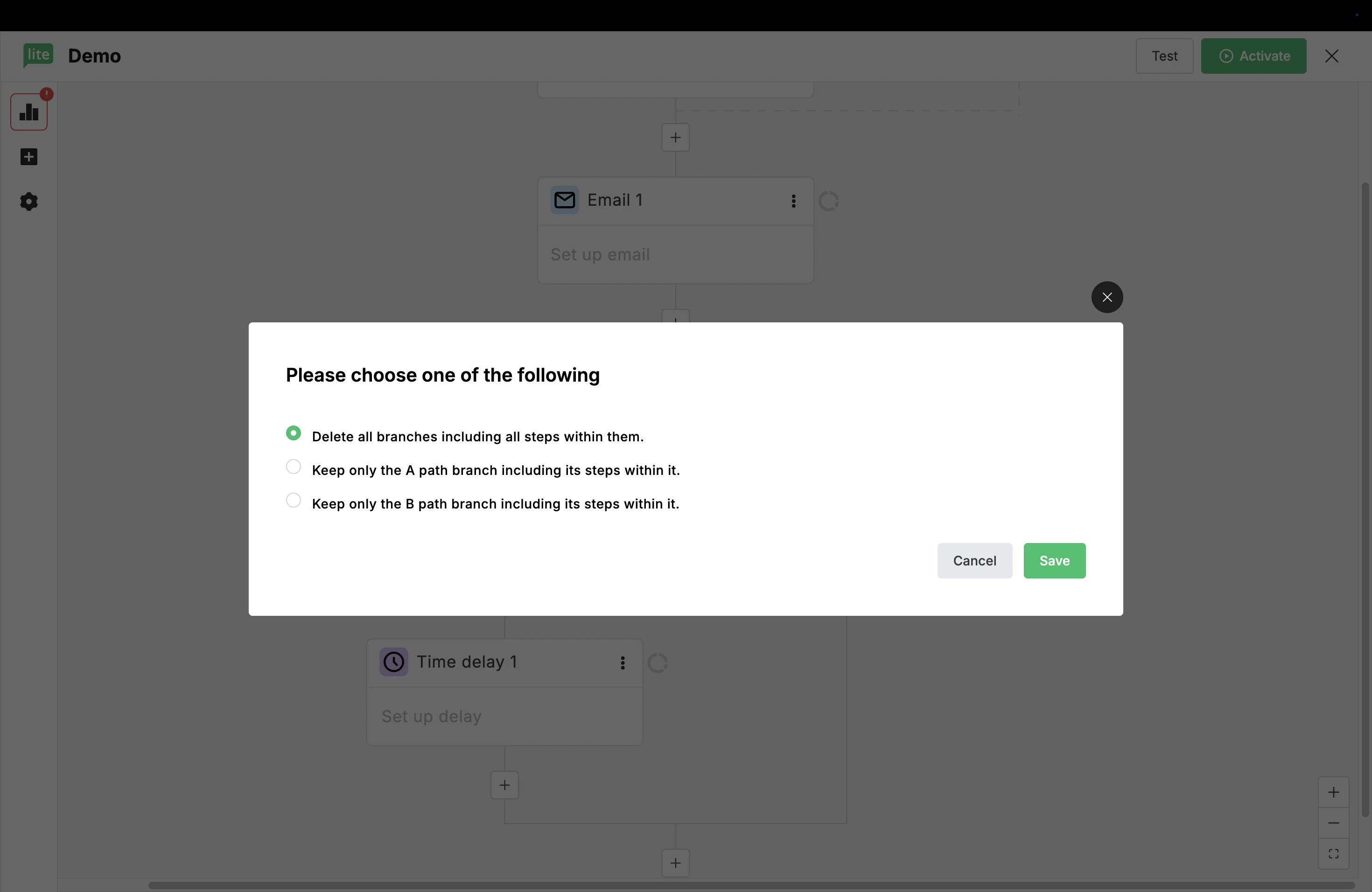 If a winner has not yet been chosen for this step, you can delete all paths and the steps within them, or delete singular paths and their following steps.