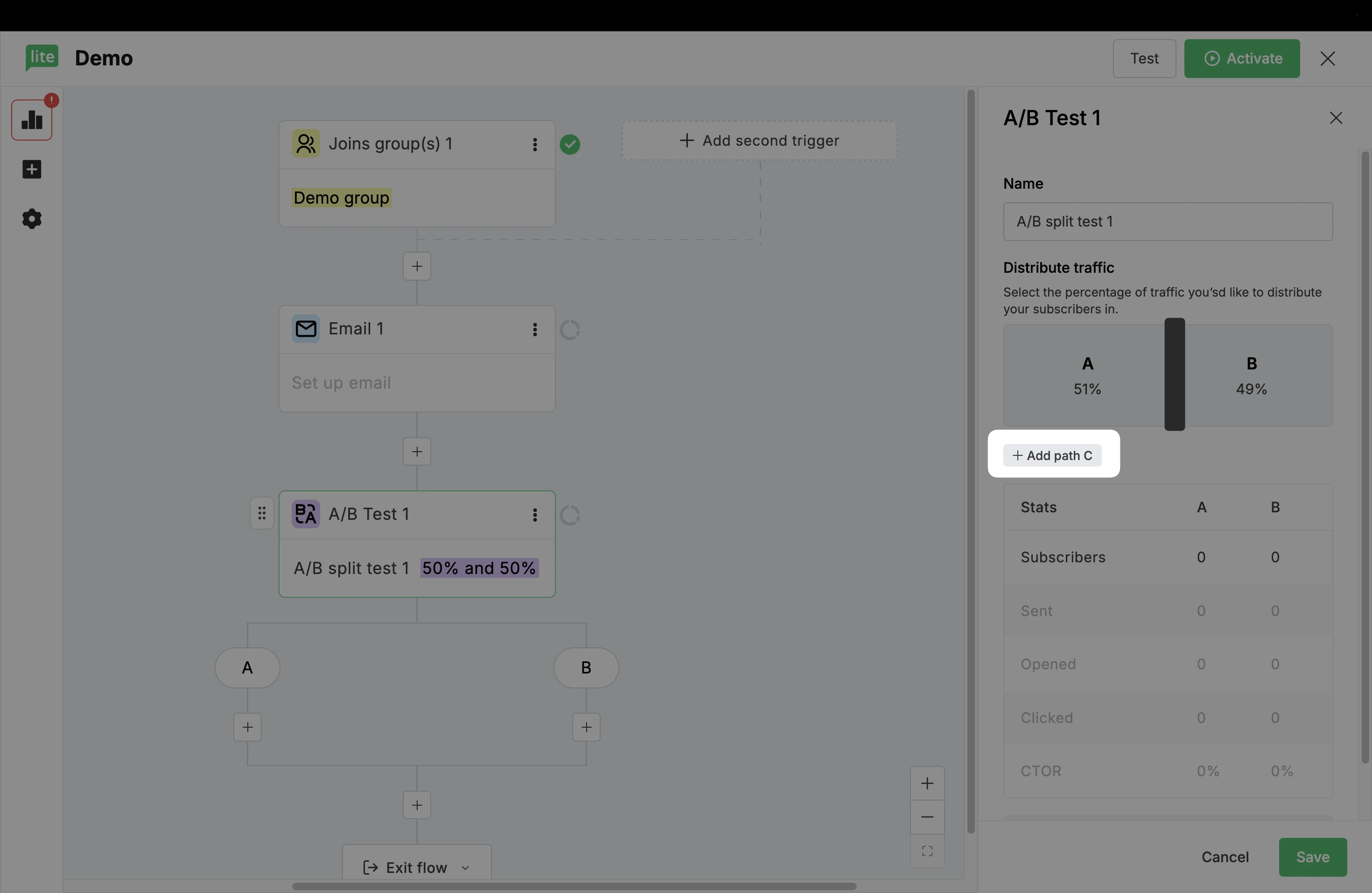 Note: There is no limit to the number of A/B tests you can add to a single workflow. Therefore, we highly recommend naming each split test so that it’s easy to differentiate each one in your automation overview.
