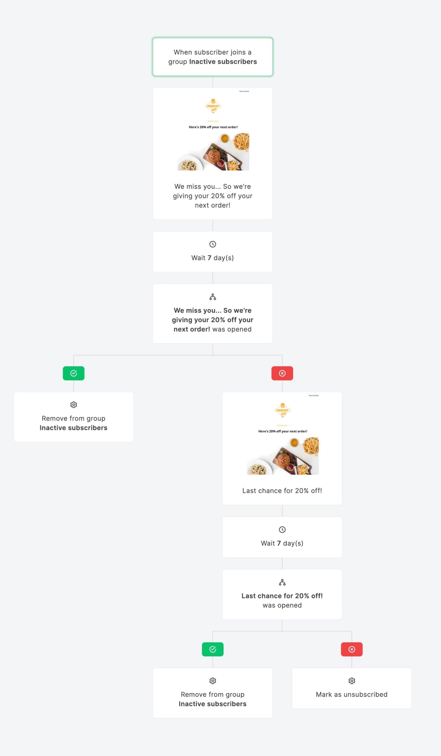 If an inactive subscriber has not opened or clicked the discount code link in the first email after a few days, you can send a second email to try to catch their attention once again. You could recreate the first email or offer a different incentive for re-engagement. Those that did interact with the re-engagement campaign can be removed from the group of inactive subscribers.