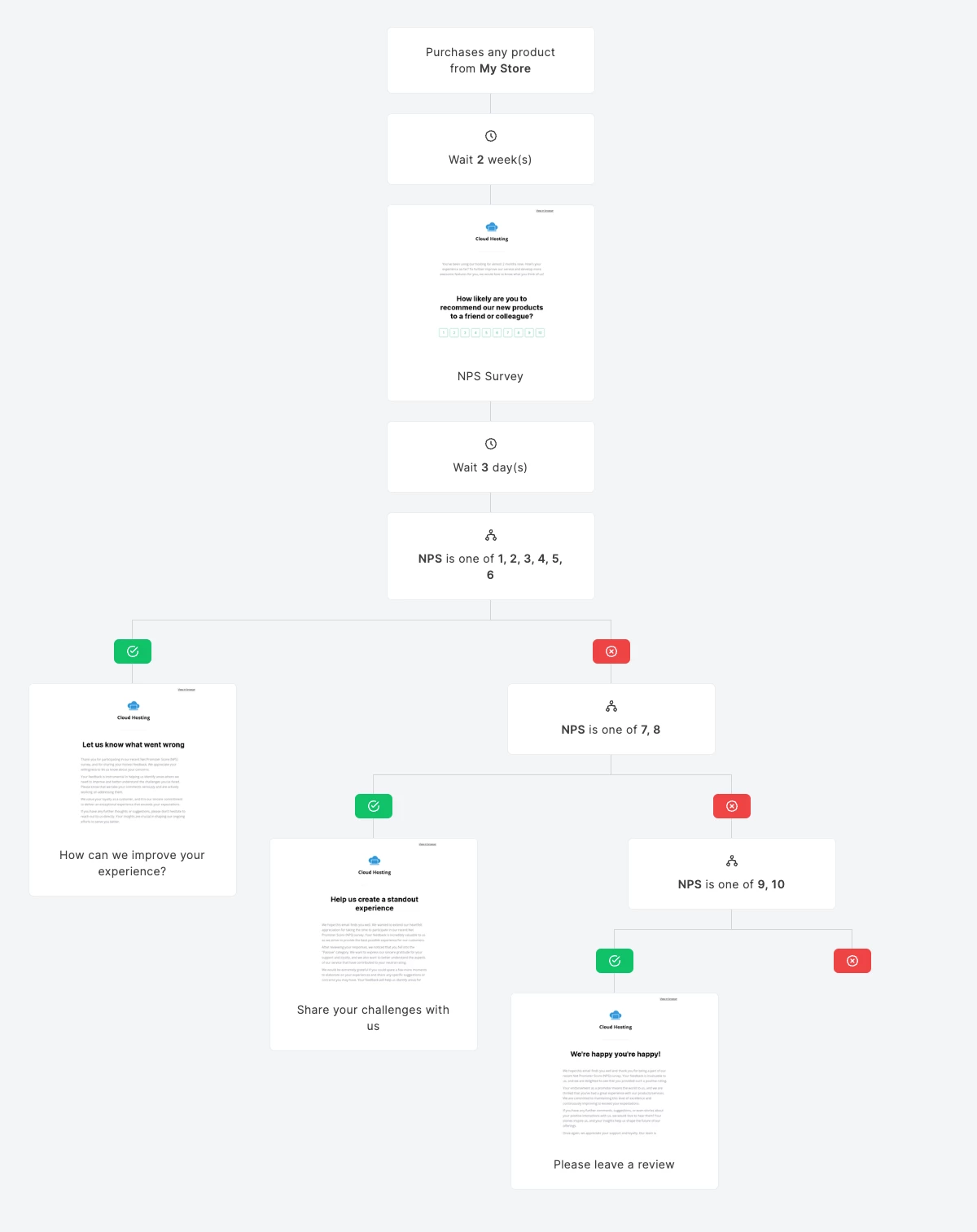The automation uses a delay step to give subscribers time to complete the survey. It then checks the subscriber’s profile field to see how they answered, and sends a relevant email depending on whether they are a promoter, passive, or detractor.