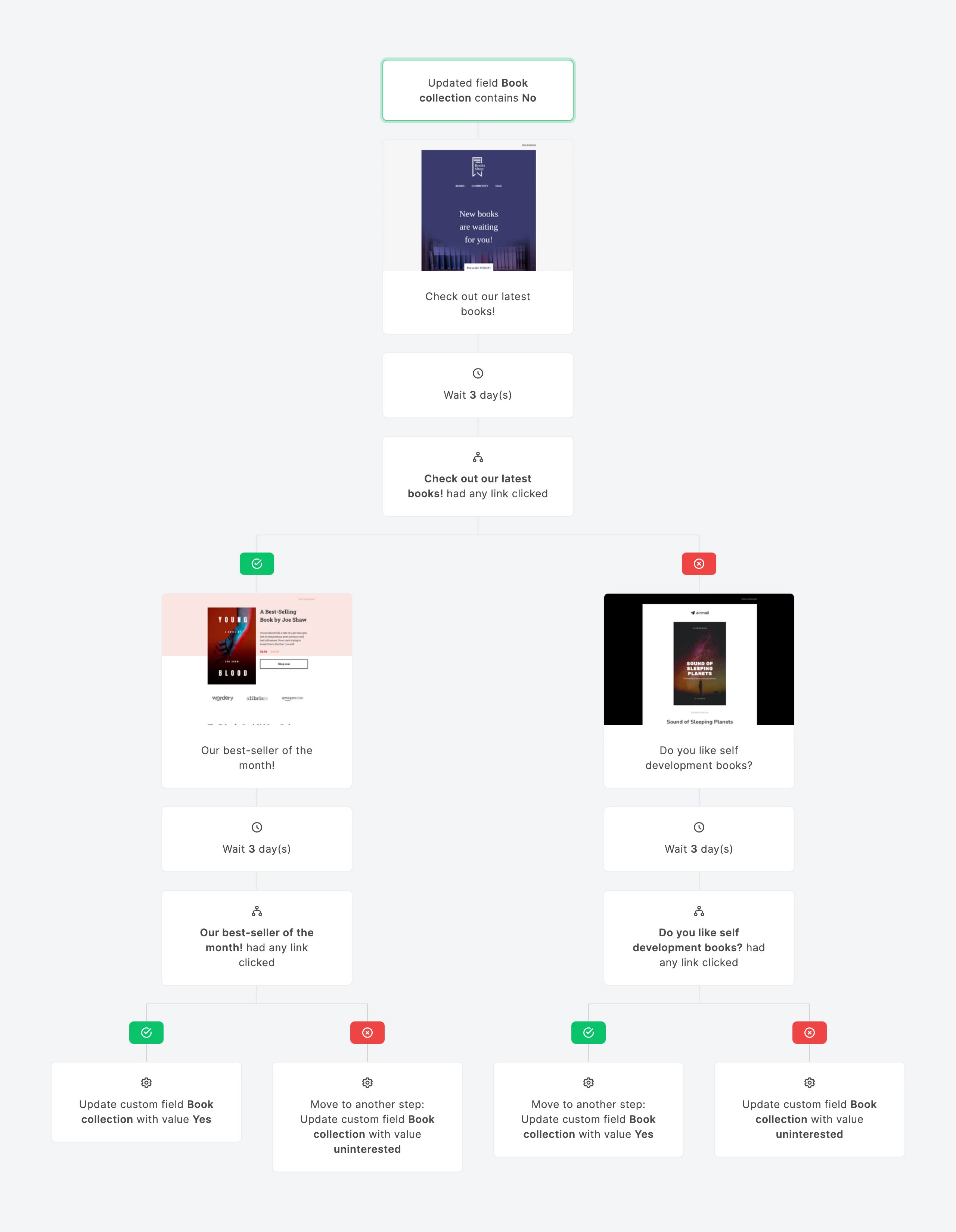 On the other branch, you’ll see a Condition step set to Workflow activity, email #3, Had any link clicked. On the No path, click the Action step and it up to update the custom field (e.g. Book collection) with value: Uninterested