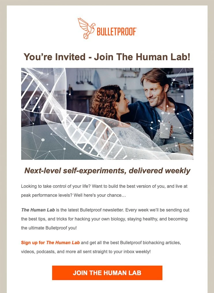 For your branding, take a look at Bulletproof. This company sells high-performance food, drinks, and supplements, but don't expect product-packed newsletters. Instead, they worked out their personas, dissected what their lives look like and address much wider topics as a result. Living your best life doesn’t only mean eating the right food, it also means productivity hacks, sleep improvement tips and mental health.