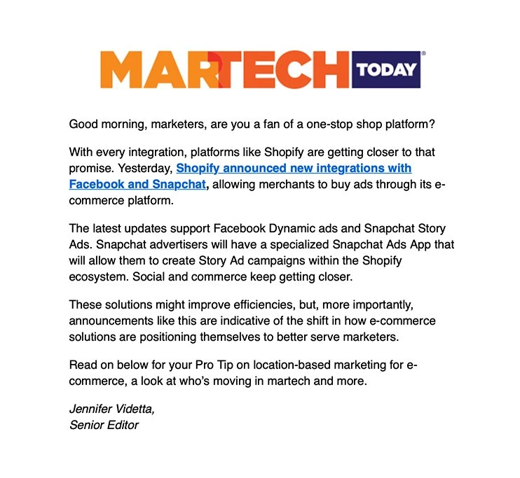 Same goes for the marketing newsletters our team loves so much, like MarTech Today. We want to be in the know, but we don’t have time to constantly browse the web looking for the latest trends. That’s why we subscribe, and while we are busy with our daily to-dos, we know that all the important trends will find a way to our inbox. Easy and free of charge!