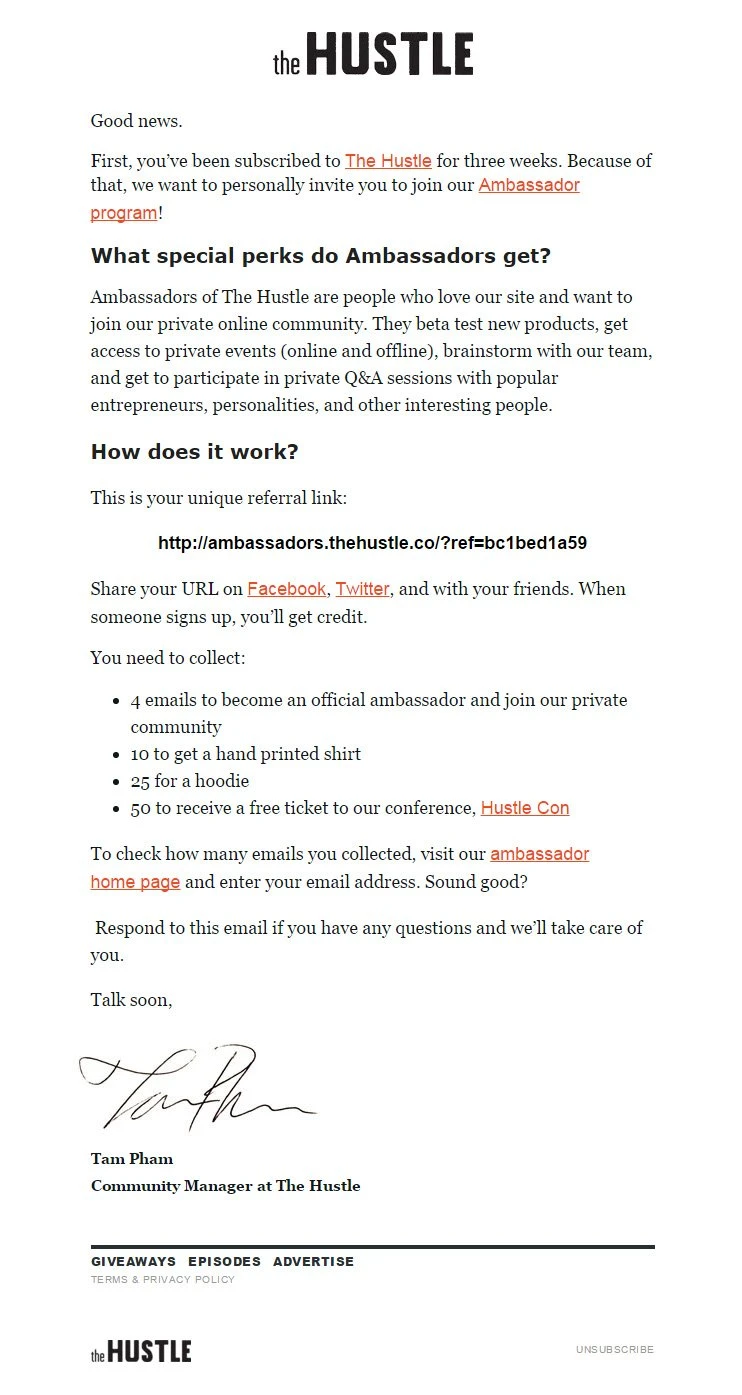 While creating their concept, they made sure to stick to their unique personality. Take Hustle, this company sends out culture and tech articles to millennials. Nothing outstanding per se, but their conversational tone makes their readers feel like it’s their friend sending them article recommendations. Their tone of voice is bold, authentic and exactly the reason why their newsletter works so well. They’re not trying to please everyone, but focus on a specific niche and adapt their brand to these people.