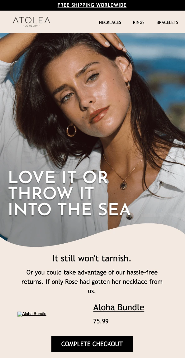 Atolea’s abandoned cart email includes a Titanic joke that appeals to its target audience. It also highlights 2 major benefits of the online store: the fact the jewelry doesn’t tarnish in water, and that you can get hassle-free returns on your purchase.