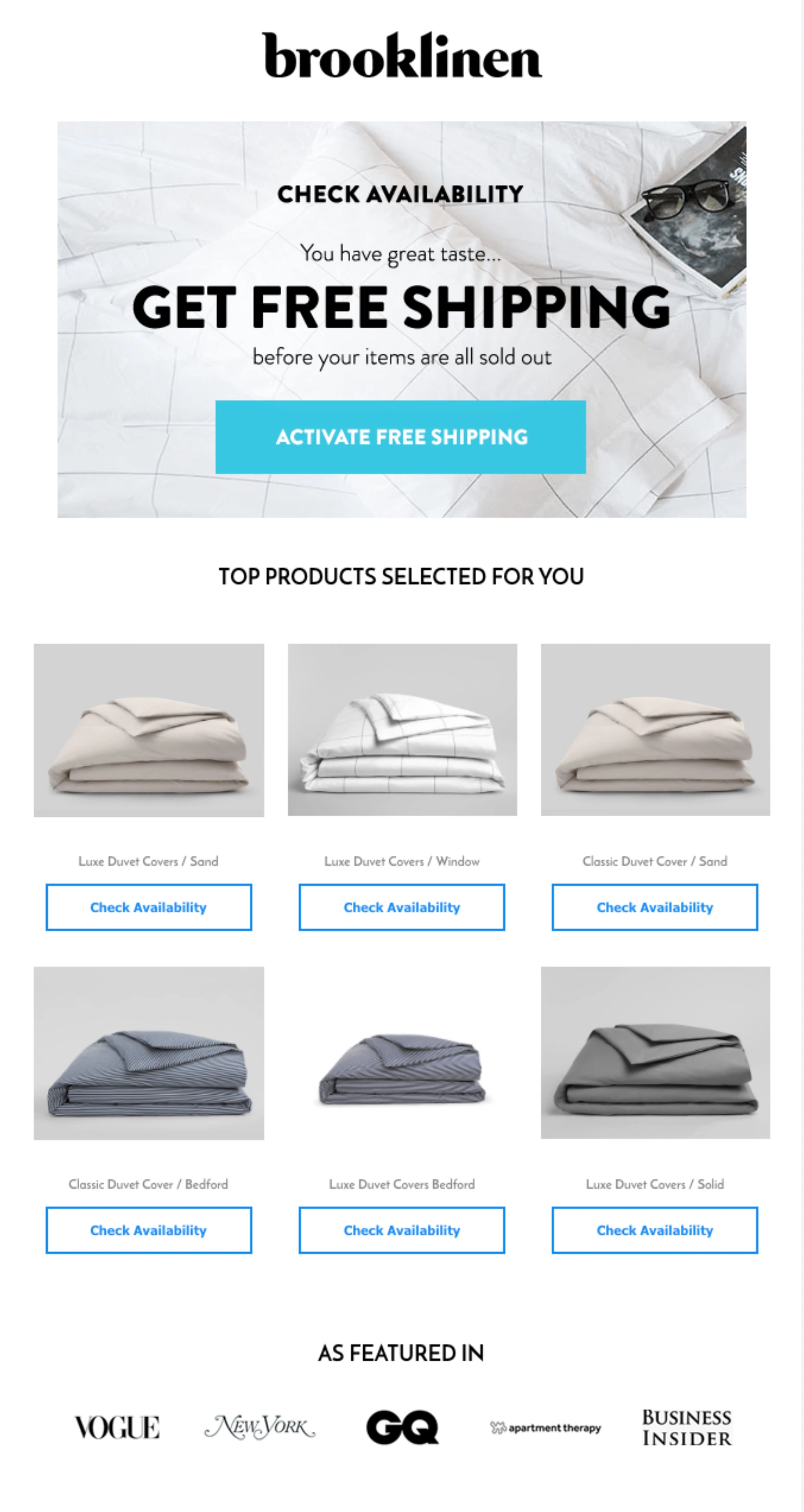 Unexpected delivery costs are one of the most common reasons shoppers abandon their carts. Brooklinen includes an offer for free shipping in its abandoned cart email, removing this common obstacle to purchase.