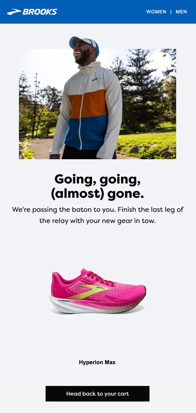 Brooks uses a fun, running-related pun in its abandoned cart email copy. This appeals to the brand’s audience and helps the email stand out. The product image and CTA are also super clear and clickable.