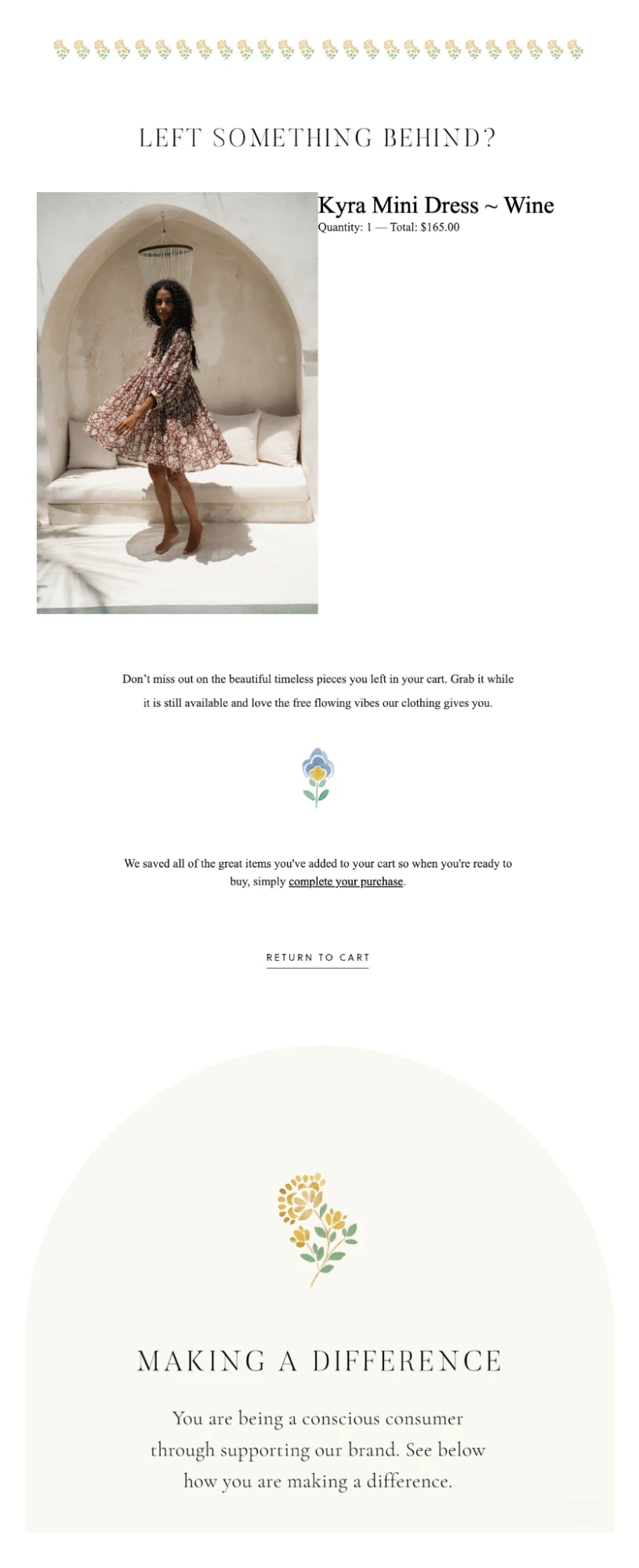 Daughters of India’s abandoned cart email includes the standard product image and link. But it stands out due to the reminder that the brand’s ethical and sustainable business practices mean you’re making a conscious choice when buying from the company.