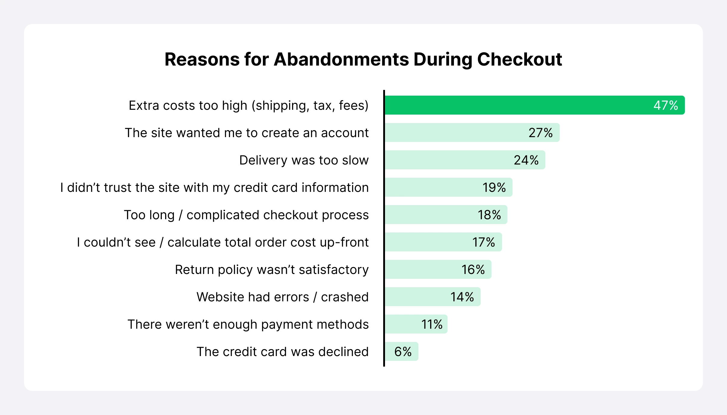 The next most common reason for cart abandonment is delivery being too slow (21%), followed by lack of trust (19%), site wanted them to create an account (19%), long or complicated checkout process (18%), unsatisfactory return policy (15%), website errors (15%), inability to see total costs upfront (14%), not enough payment methods (10%) and finally, declined credit cards (8%).