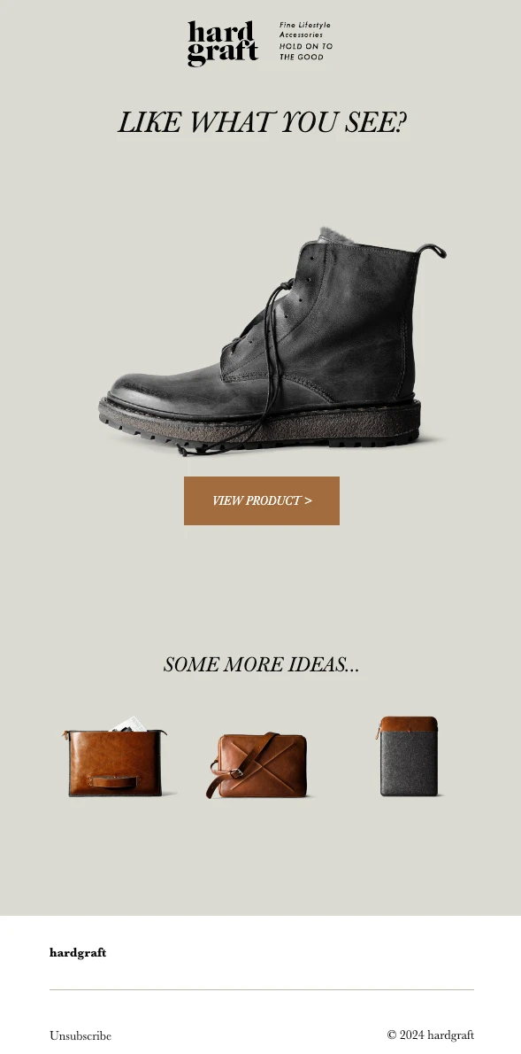 Hardgraft’s abandoned cart email stands out as it includes a selection of product recommendations as well as the image of the abandoned item. This combo could increase the value of the final purchase.