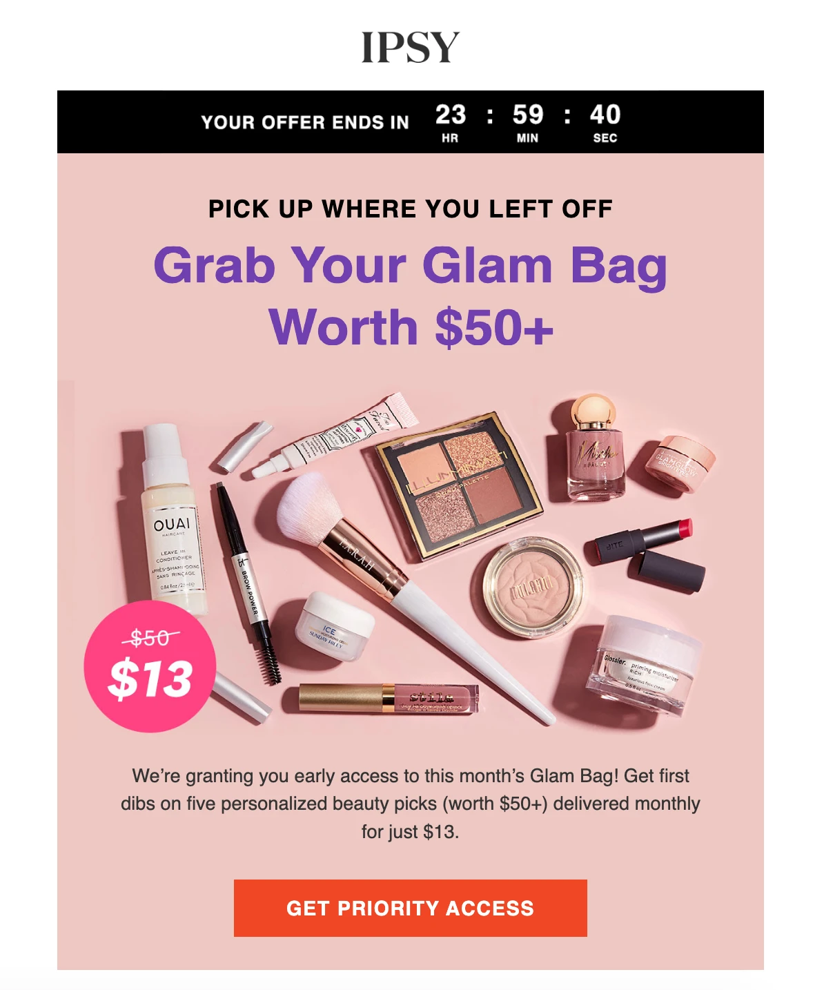 Subscription beauty box service, IPSY, creates a fear of missing out in their abandoned cart email example by offering a limited-time incentive. Their use of a countdown timer makes the offer expiry date extremely clear—subscribers know exactly how long they have before they lose access to the incentive.