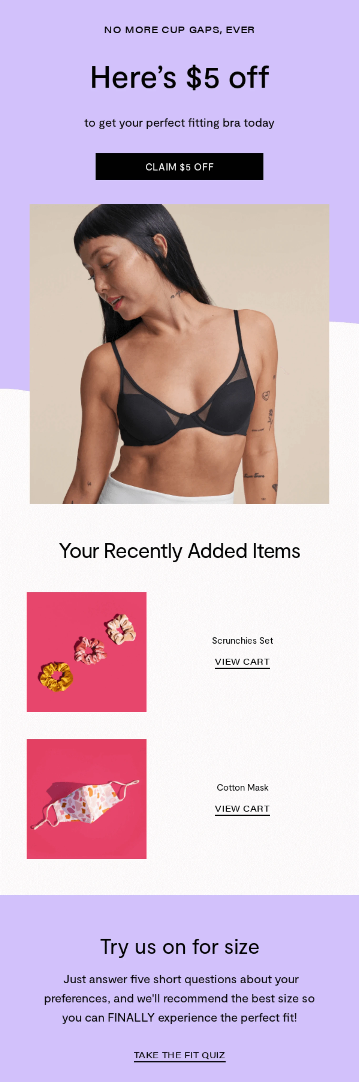 Pepper’s abandoned cart email includes a $5 discount coupon for the selected items. This offer may be all the encouragement the recipient needs to complete the purchase.