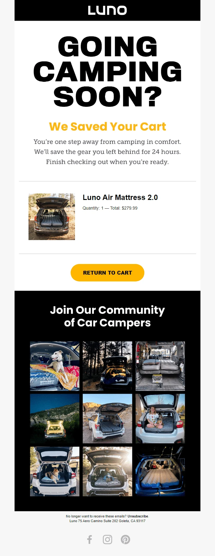 Luno injects social proof into their abandoned cart email campaign by including social media posts from happy customers. Readers can see the abandoned products in action, which makes it easier to picture themselves using it. And let’s be real, who wouldn’t get a little FOMO looking at those dreamy camping pics!