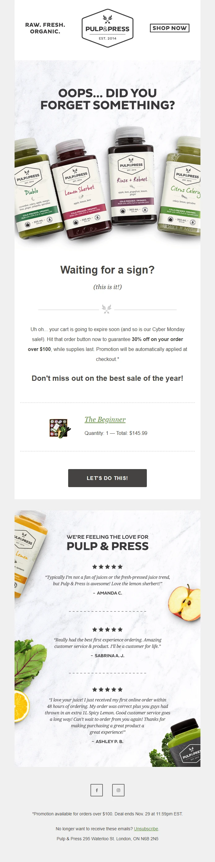 Pulp & Press uses two different tactics to generate urgency in their cart abandonment email. First, the brand reminds customers that their cart will expire, and then it mentions that the Cyber Monday sale is coming to an end.