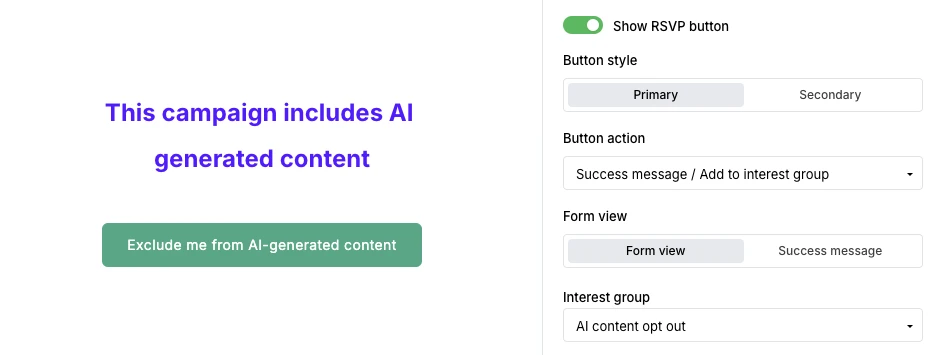 Alternatively, use our event block to add a button to your email that automatically adds people who click on it to an AI content exclusion group.