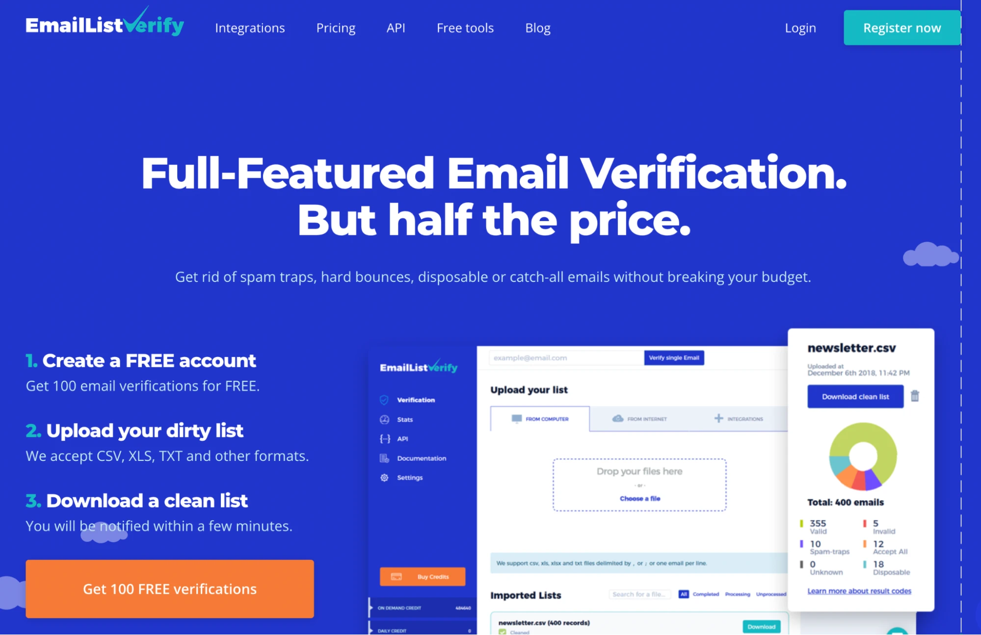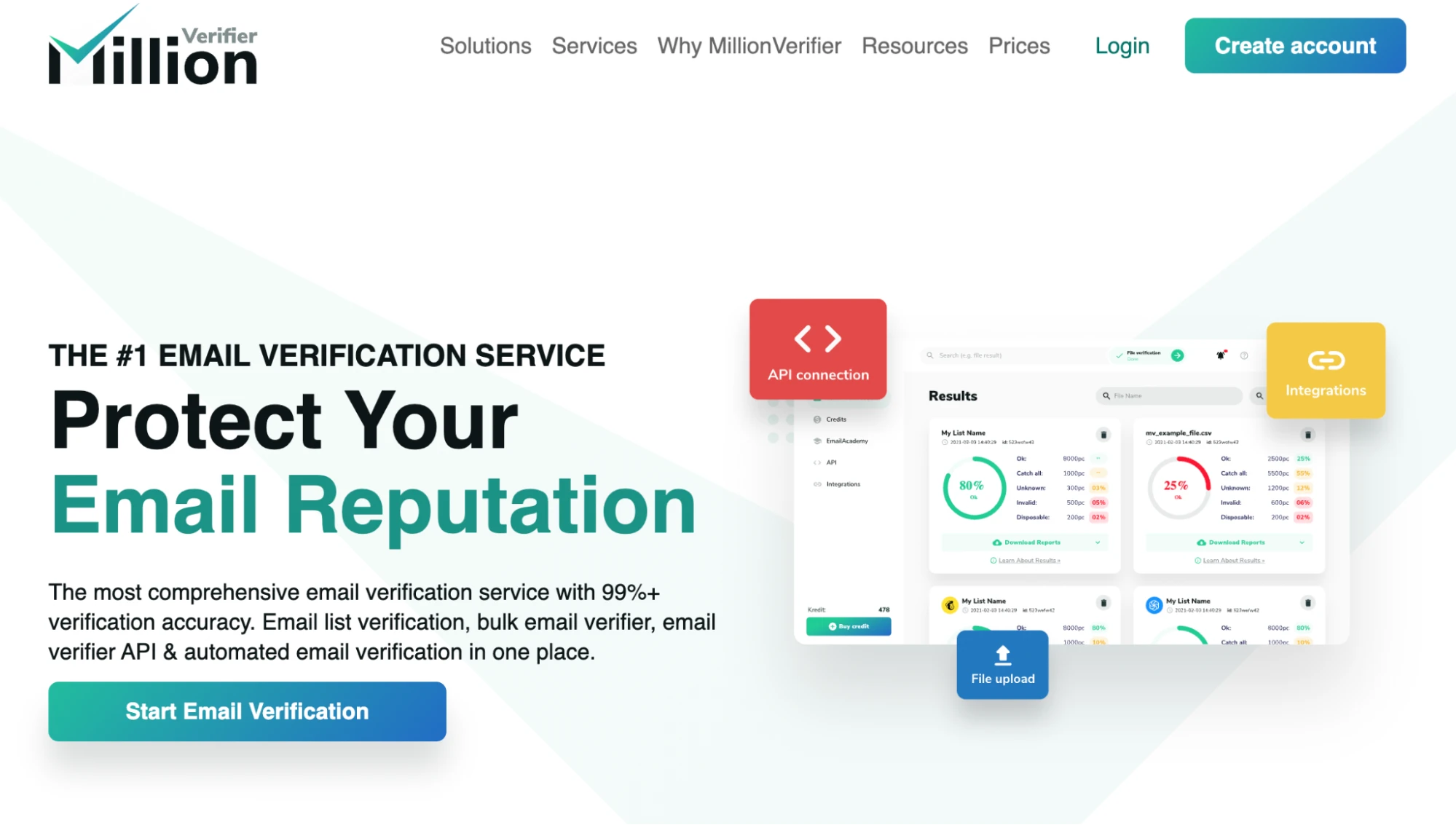 MillionVerifier is an email list cleaning tool with all the core features you need, including email list verification, a bulk email verifier, and API access. It also has automated email verification that syncs with your email service provider. The tool claims 99% accuracy and it integrates with 17 different email marketing platforms.