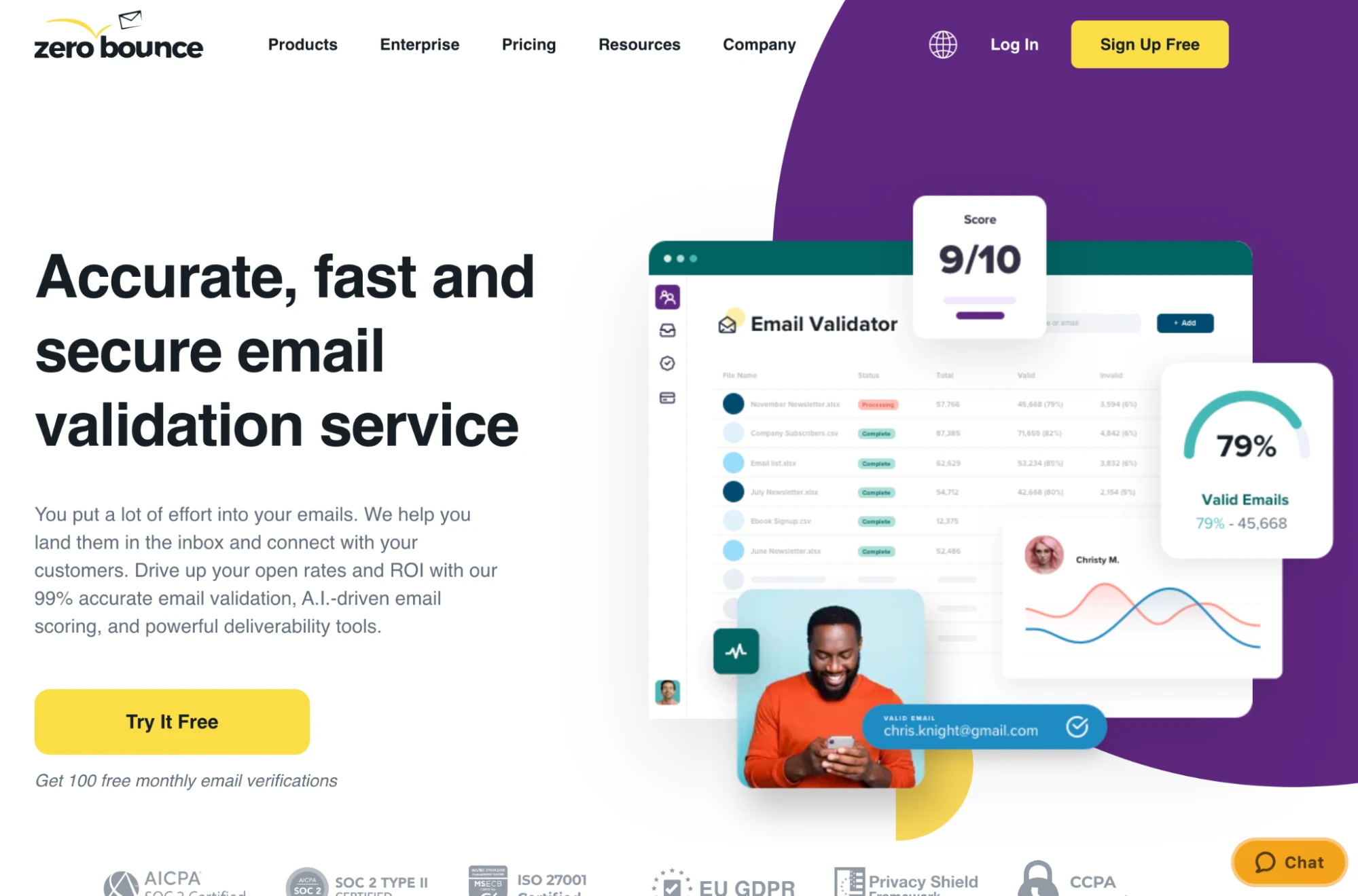 ZeroBounce is an email list cleaning service with all the tools you need to ensure emails land in your subscribers’ inboxes. Analyze your existing list to discover low-quality email addresses and remove them. Then use the ZeroBounce API to check new email addresses in real-time as people subscribe.