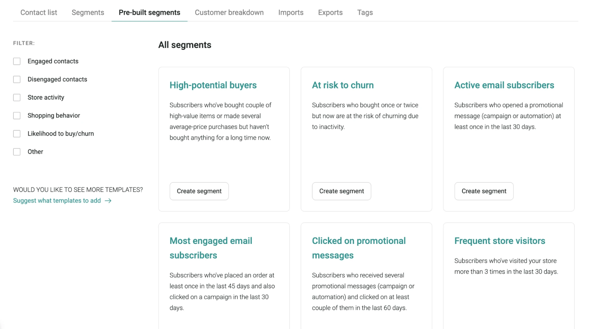 And another really nifty feature? The platform automatically creates smart segments based on your Shopify data, like: