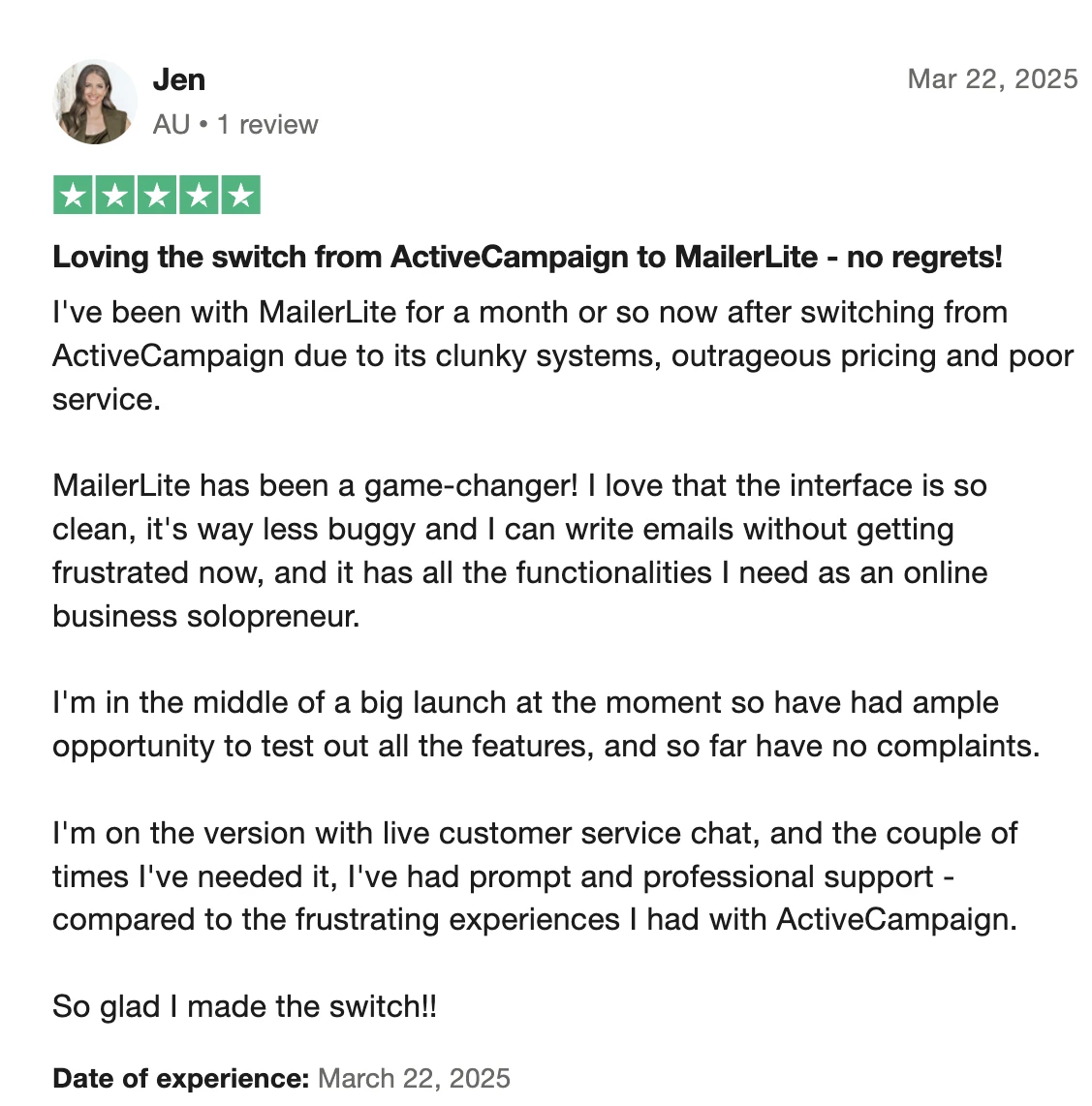 “I kissed quite a few frogs before I found MailerLite. I was with Klaviyo, ActiveCampaign, MailChimp and a few others. But I had so many problems. MailerLite is the first platform that is techy enough to do what I need, but easy enough that I don’t end up making massive mistakes, which I have done with other platforms. MailerLite has 100% worked.”