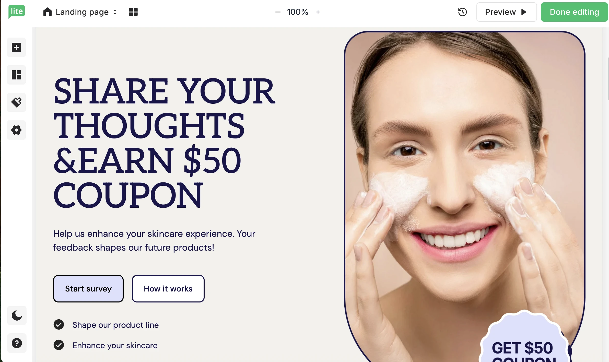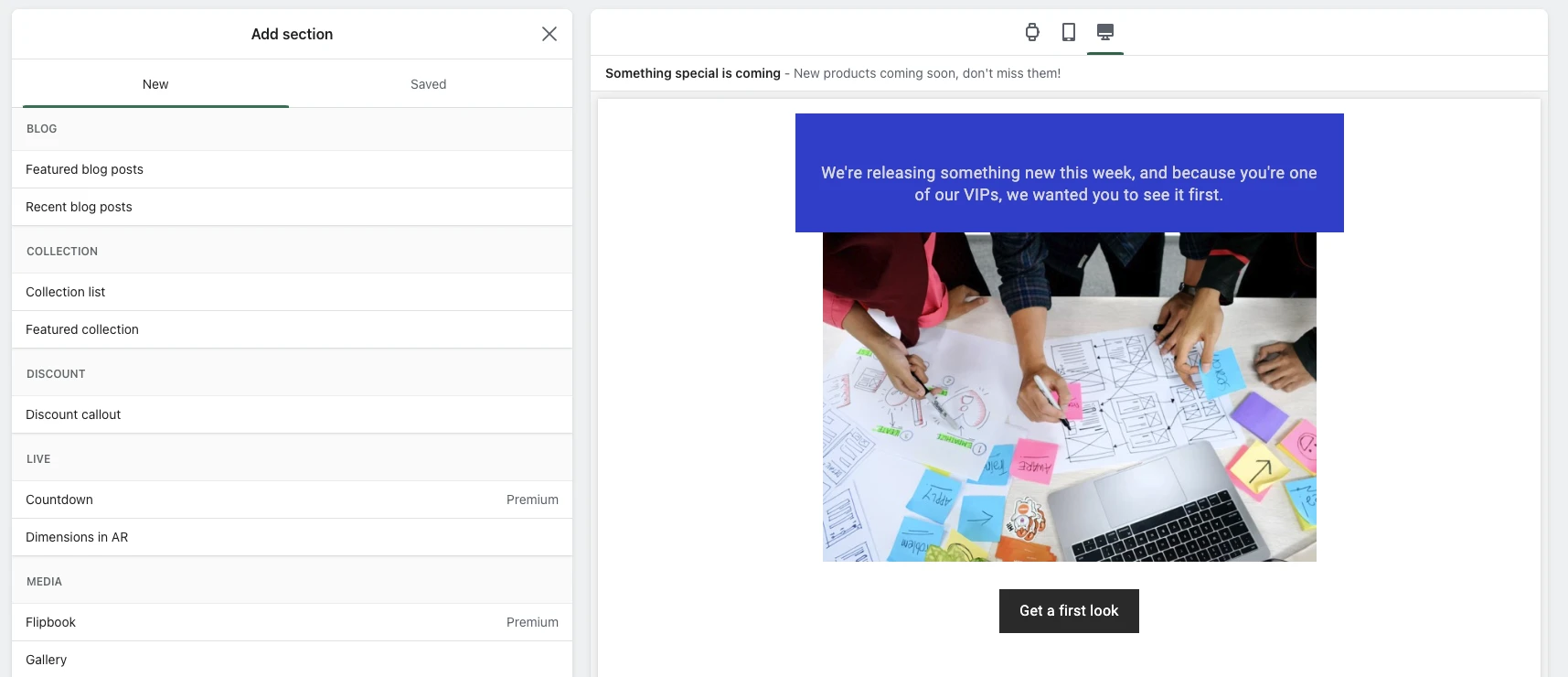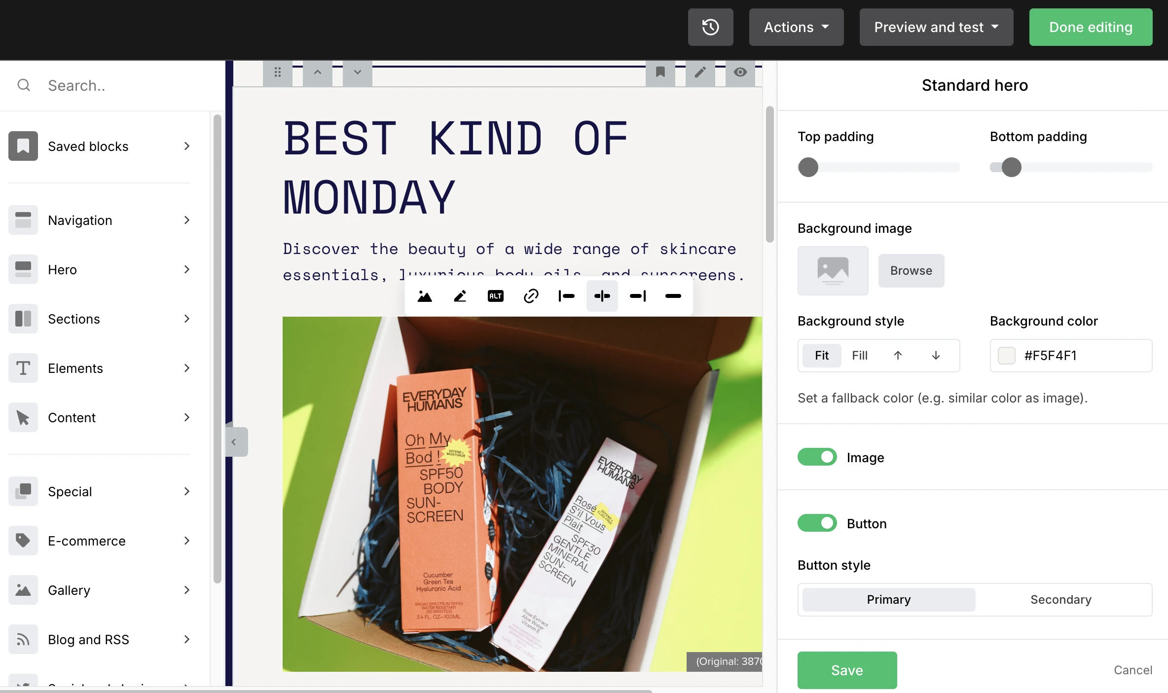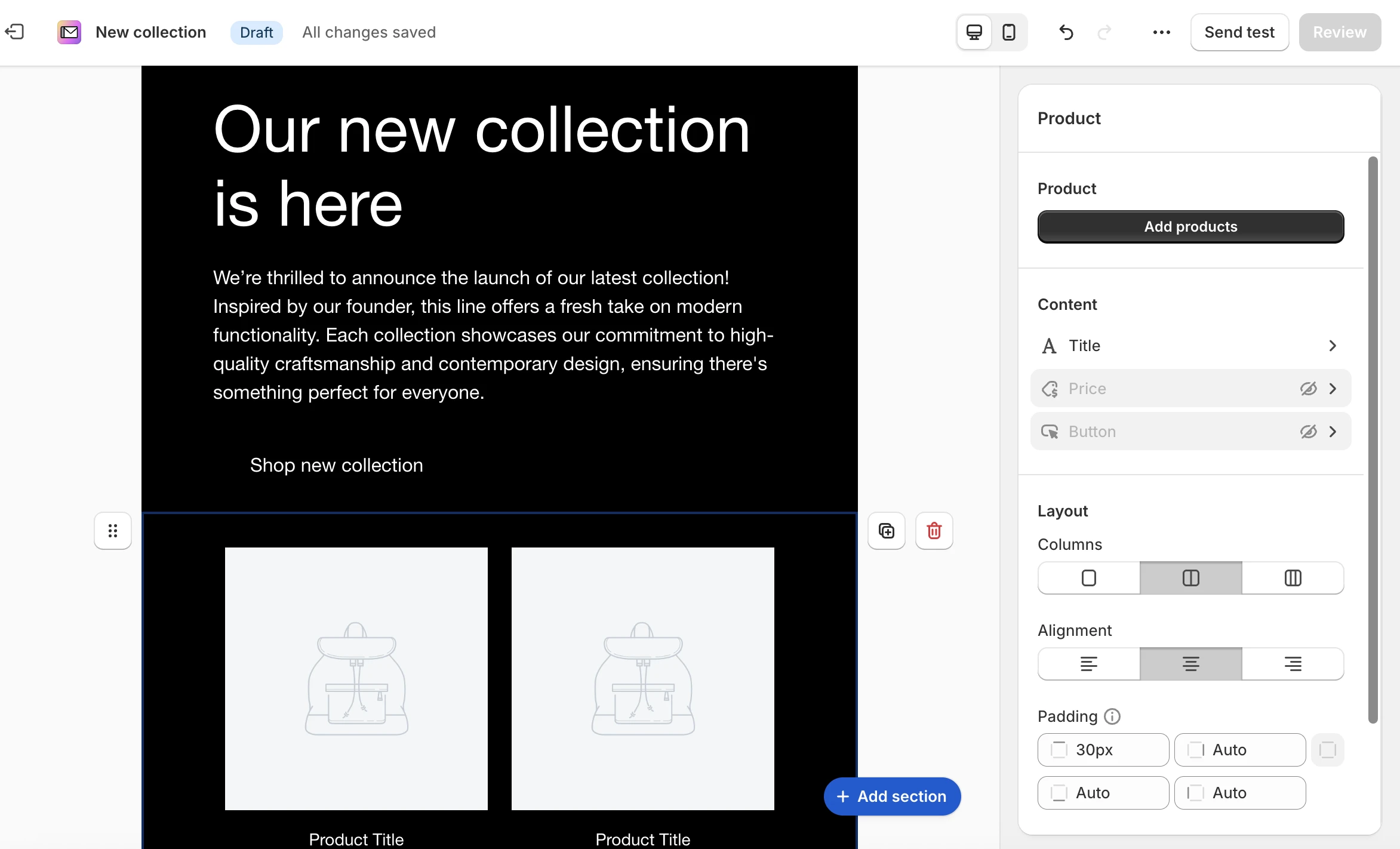 The drag-and-drop editor is super easy to use, and I particularly liked the e-commerce blocks that let you showcase products directly from your Shopify catalog. You can add: