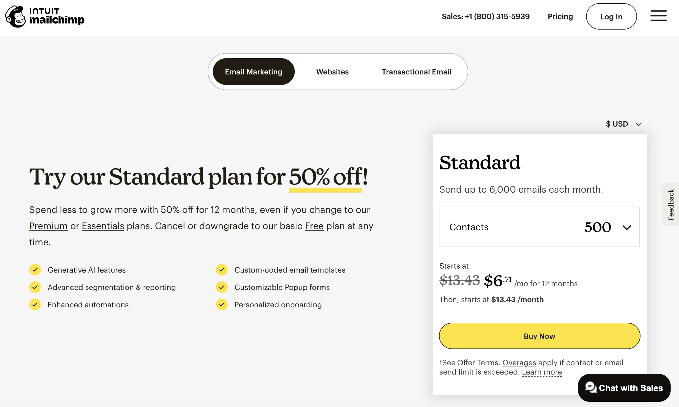 When you’re ready to scale, paid plans start at just $10/month ($9 billed annually) for up to 500 contacts with unlimited emails.