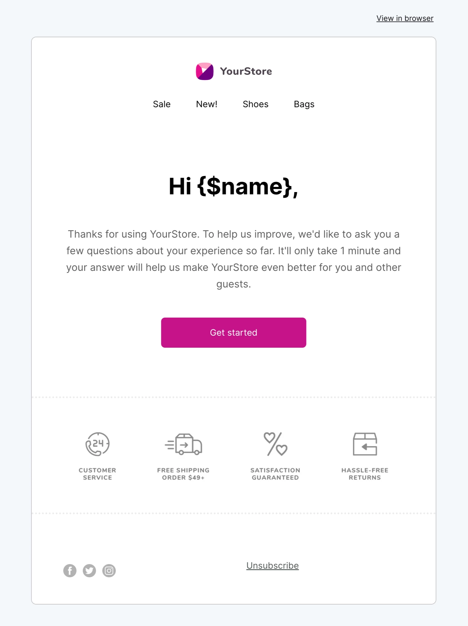 Nurturing can occur even after a purchase. This after-purchase email helps you get feedback from recent buyers and new customers by sharing a link to an interactive survey that you can use to generate insight needed to power future sales.