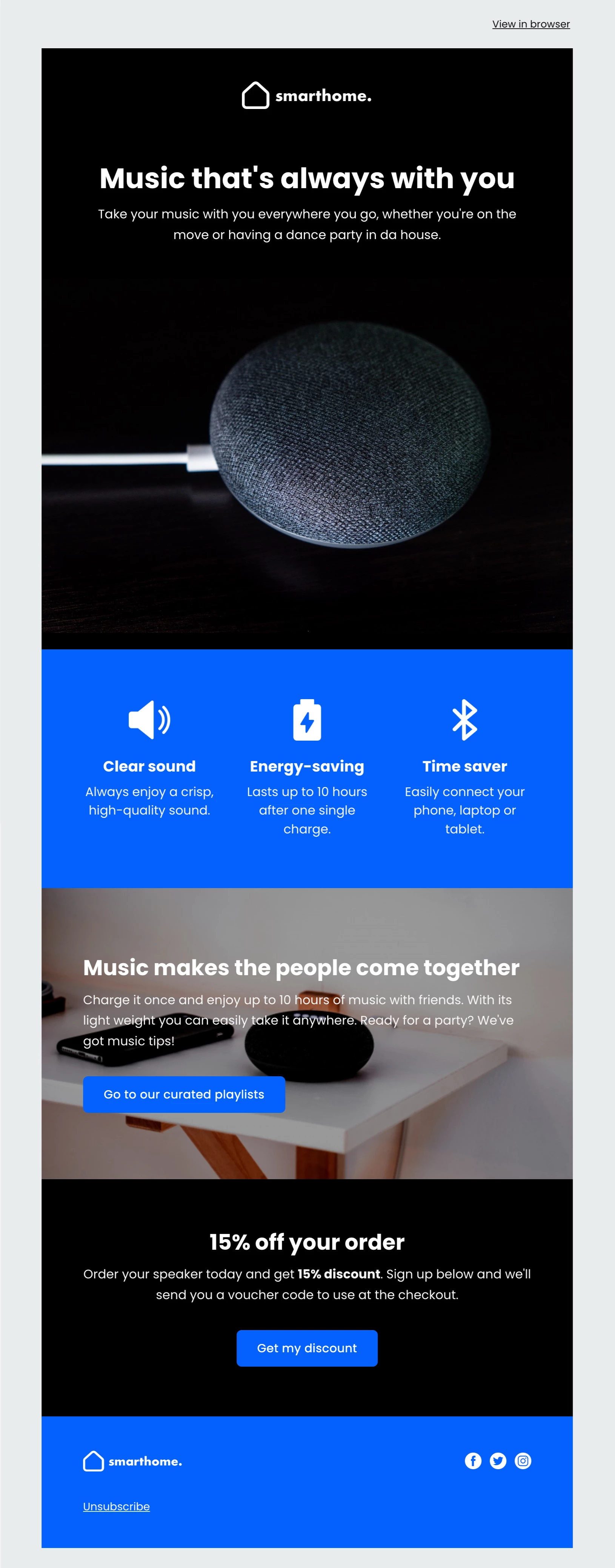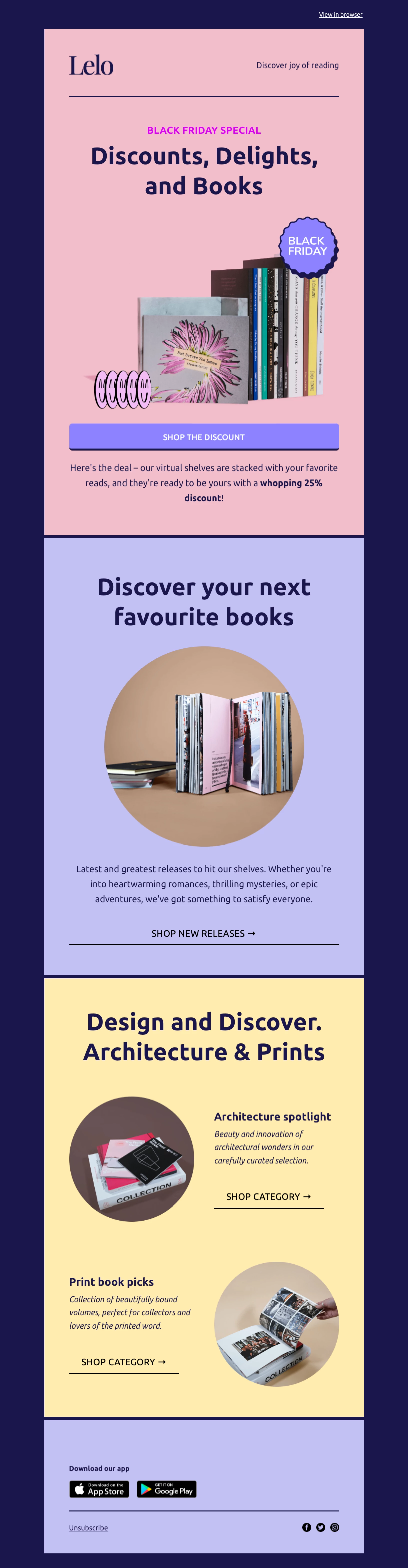 High-converting e-commerce email templates will typically include content like discount codes, product boxes, countdown timers, and customer reviews.