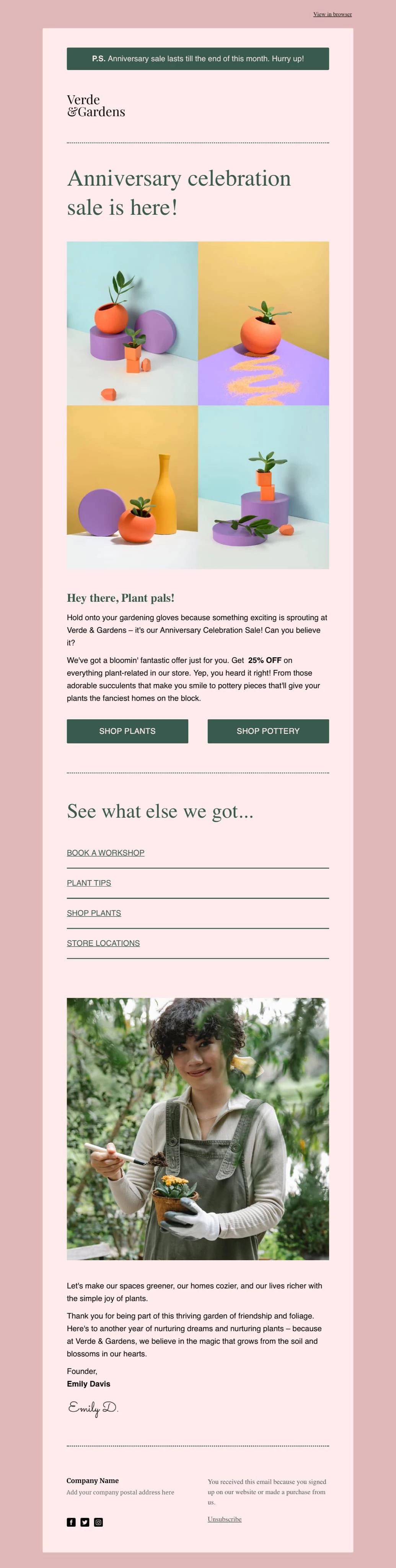 Sale announcement emails let people know about your latest offers and seasonal sales.
