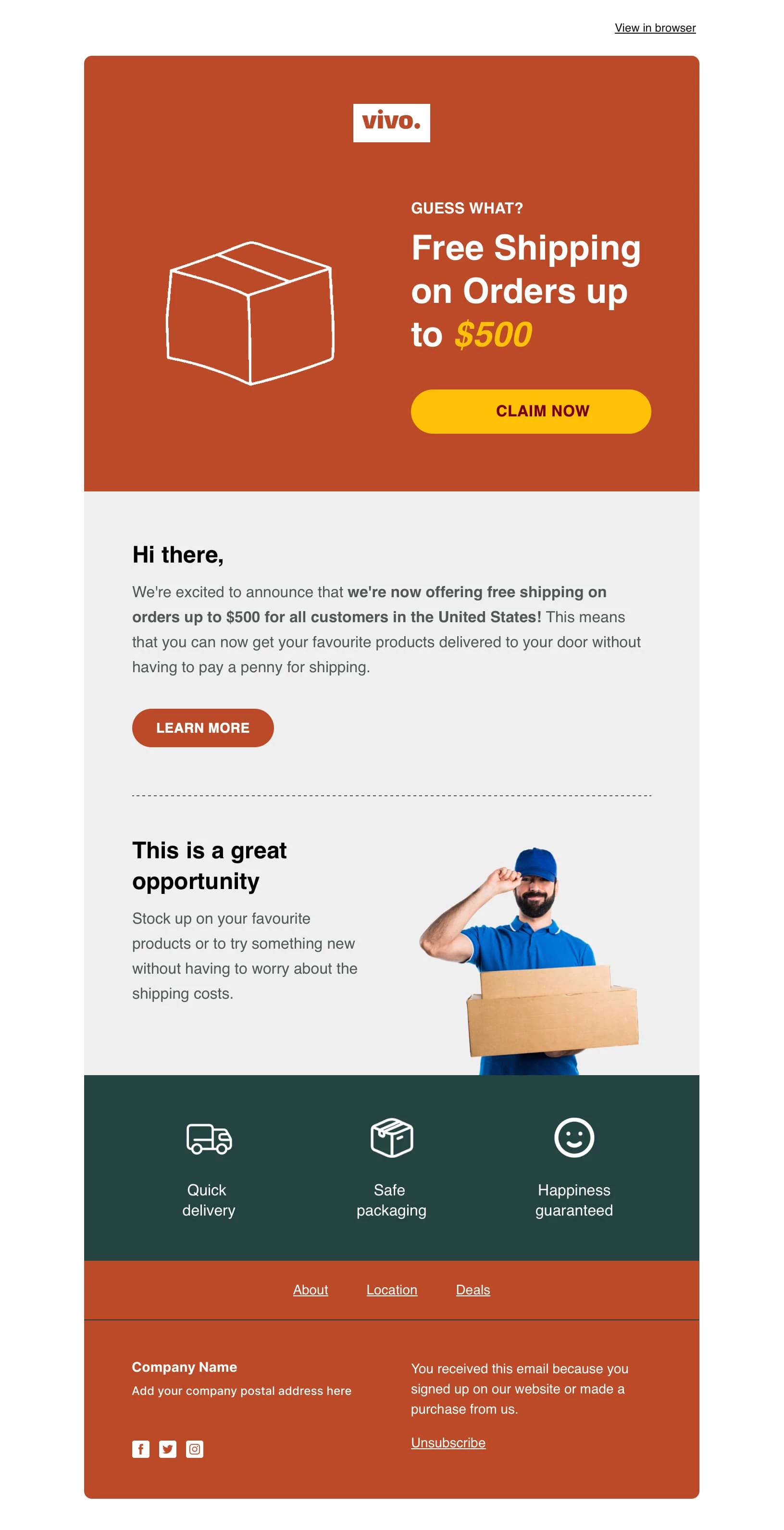 Use this free shipping email template to incentivize sales by removing the delivery fee.