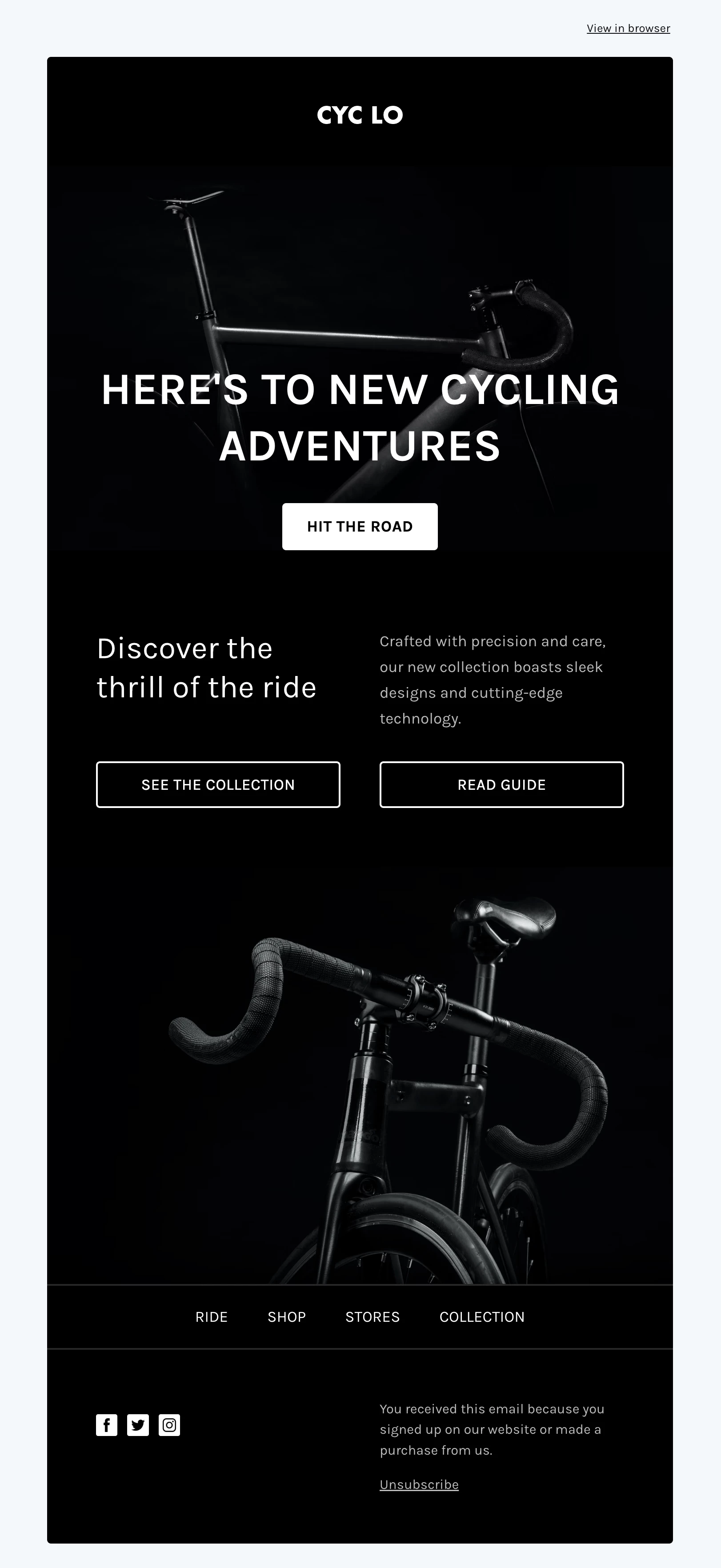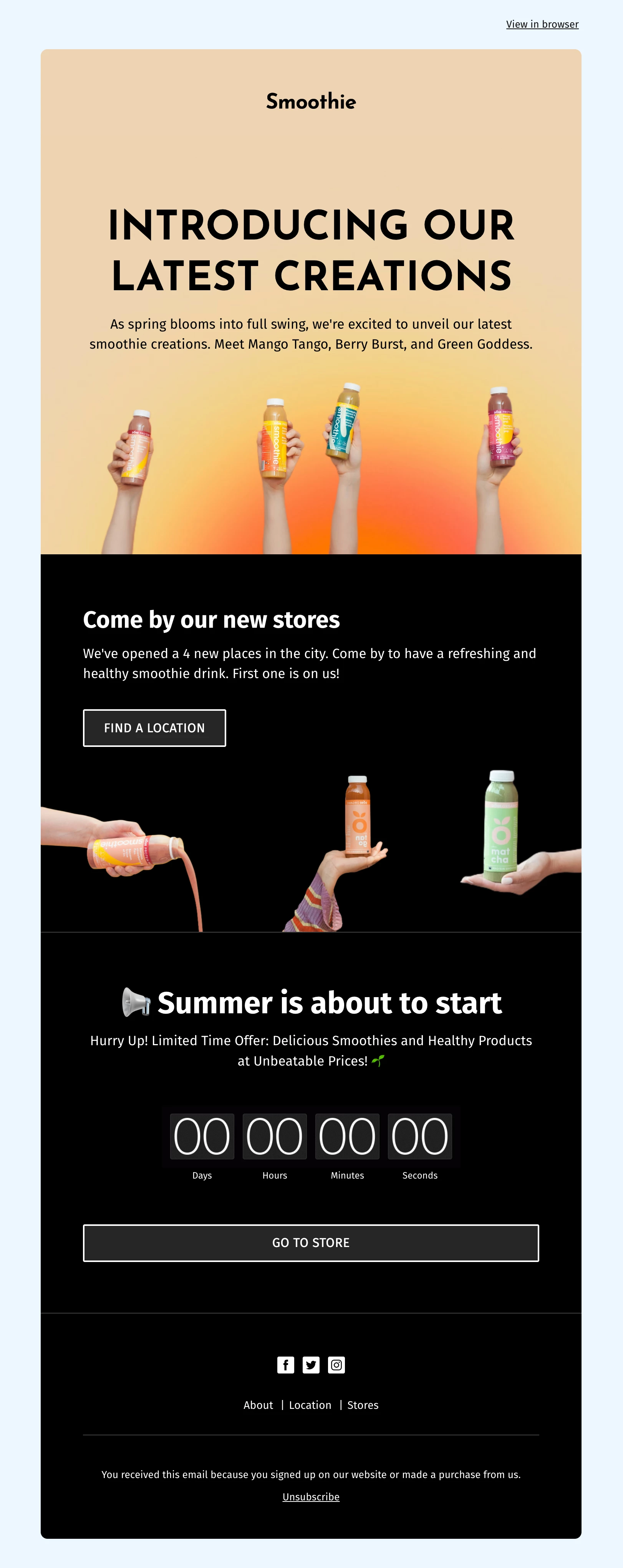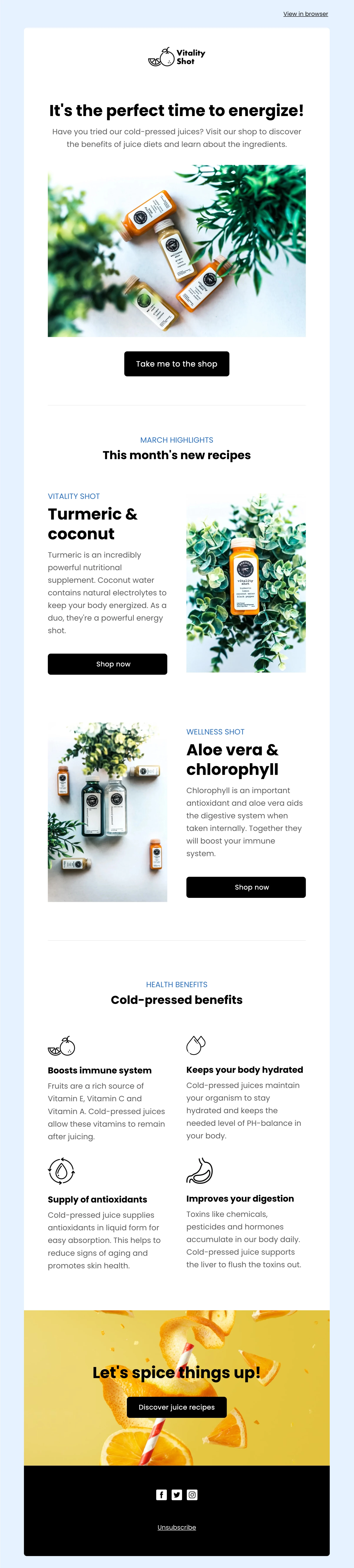 This email template is perfect for businesses with a physical location and a regularly changing stock list. However, e-commerce stores could adapt it by adding product blocks to let recipients buy the products online.