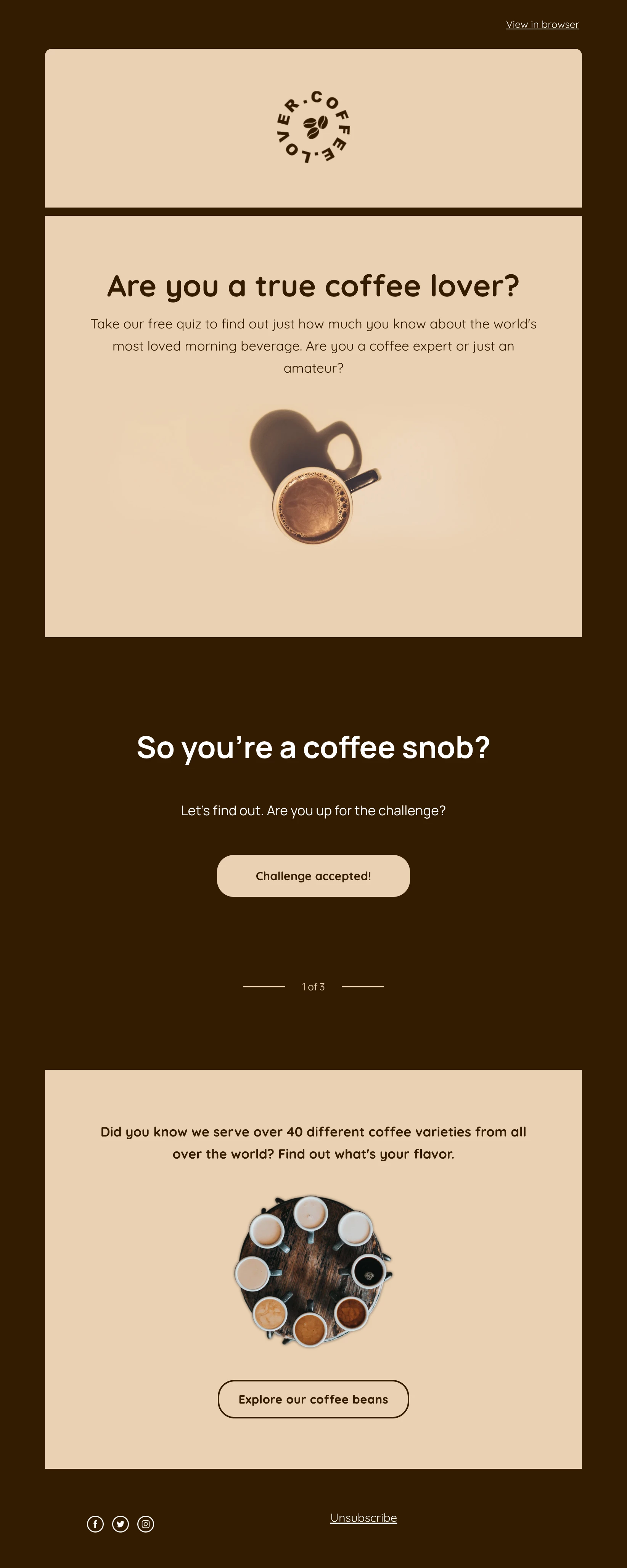 Discover subscriber preferences with this fun quiz email template, complete with an in-email quiz people can answer from their inbox.