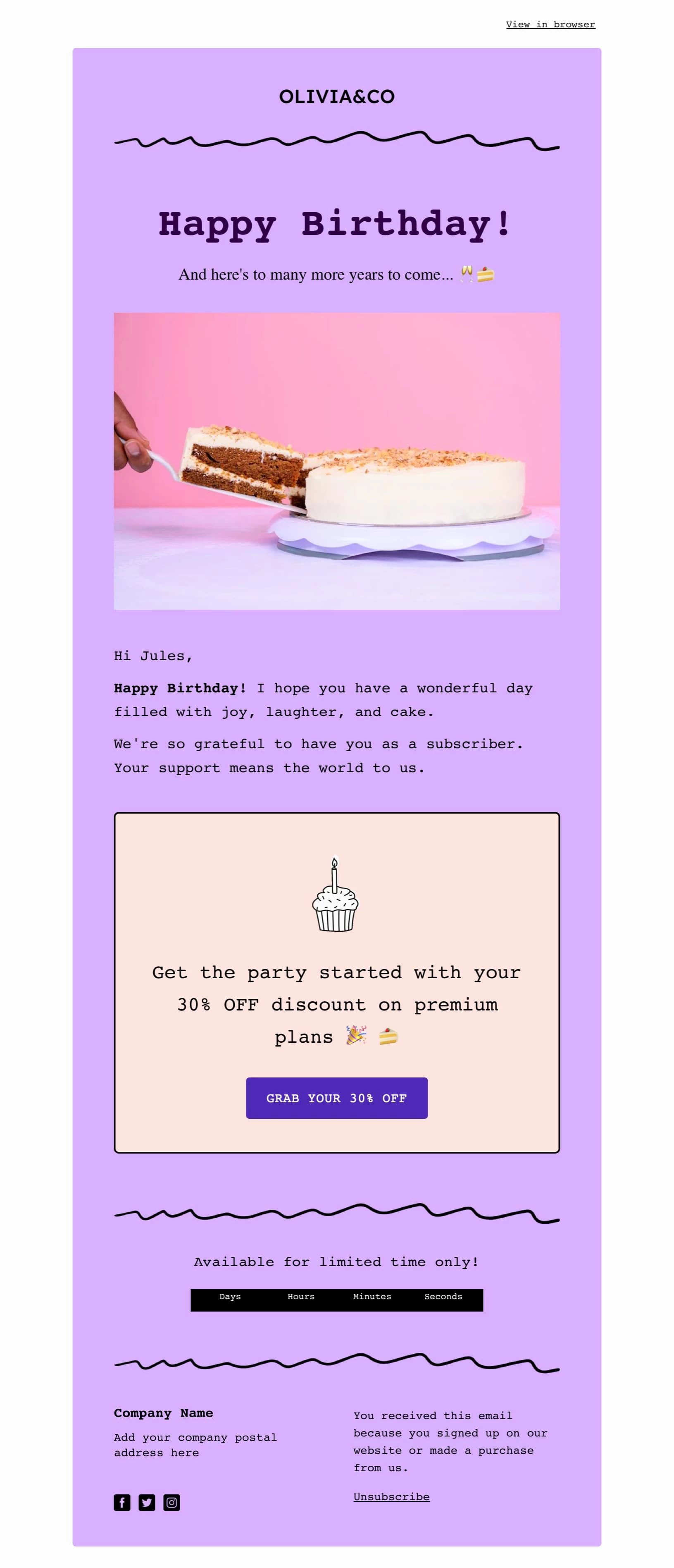 Celebrate your customers’ big days and generate sales with a birthday email template and a limited-time offer.