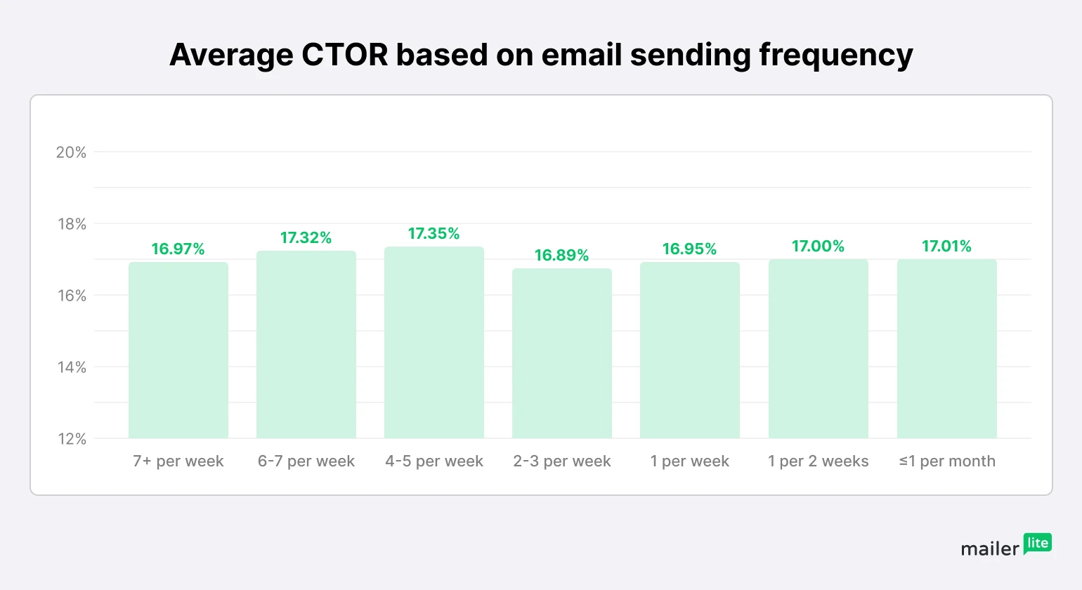 With the above point in mind, click-through rate can be a better metric to measure campaign engagement. The below chart shows the average email click-through rate based on email sending frequency.