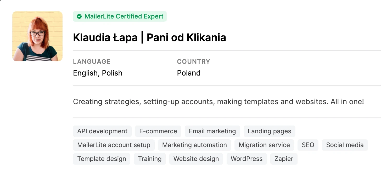 Klaudia Łapa is a MailerLite Certified Expert based in Poland who offers an all-in-one service, from strategy and account setup to template and website creation. Fluent in English and Polish, she brings both technical skill and creative flair to every project.