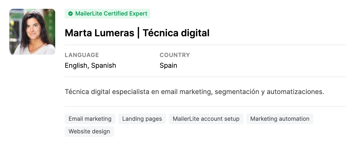 Marta Lumeras is a MailerLite Certified Expert based in Spain, specializing in email marketing, segmentation, and automation. Fluent in English and Spanish, she’s well-suited for businesses targeting bilingual or international audiences.