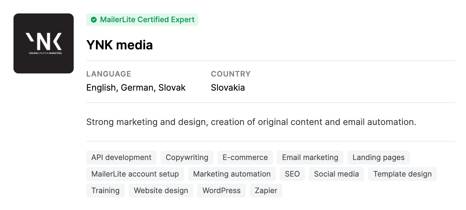 YNK media is a MailerLite Certified Expert based in Slovakia, offering strong marketing and design skills with a focus on original content creation and email automation. 95% of their client work is focused on email marketing.