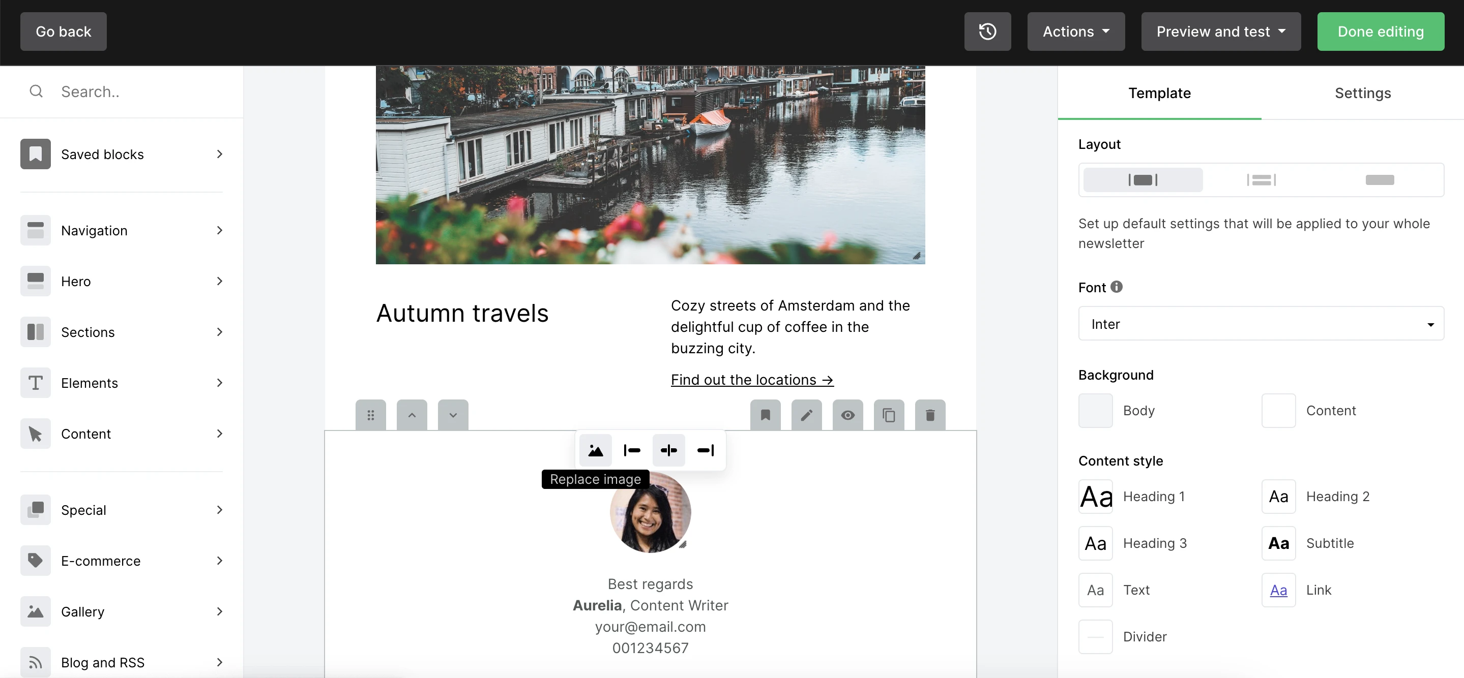 And that’s all there is to it! You can save this as a custom block by hovering over signature block, clicking the Template icon, entering a name for your signature, and clicking Save.