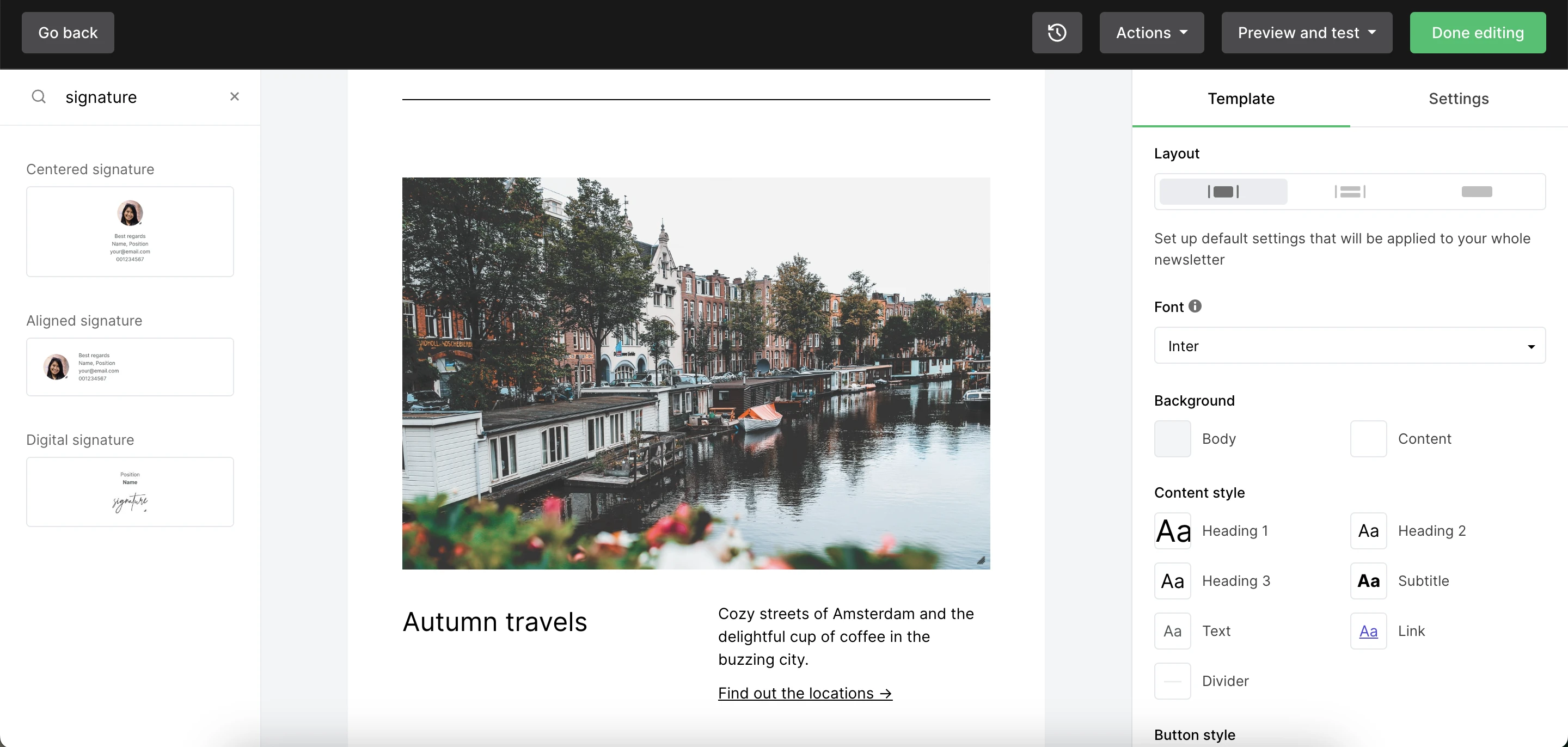 In MailerLite, your email sign-off consists of a signature and a footer section. Here’s how to create each one.