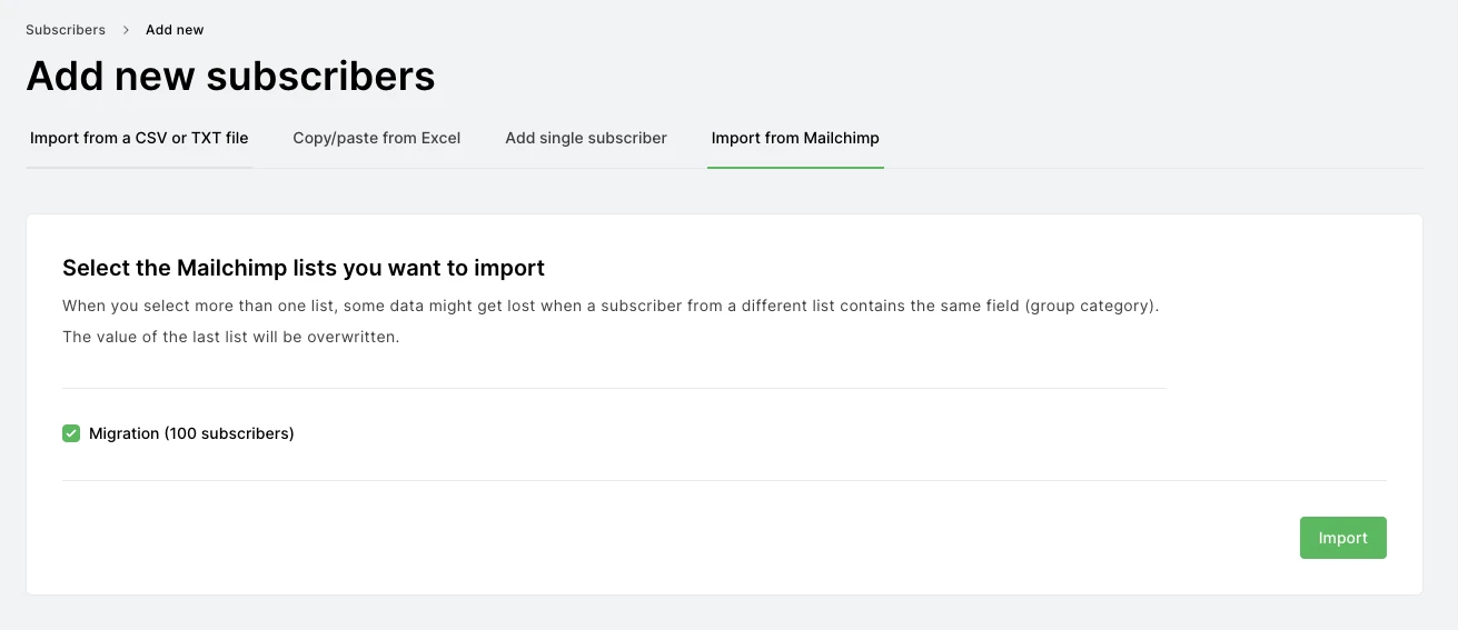 You can access the integration by heading to the Subscribers menu in your MailerLite dashboard, clicking Add new, and then selecting the Import from Mailchimp tab.