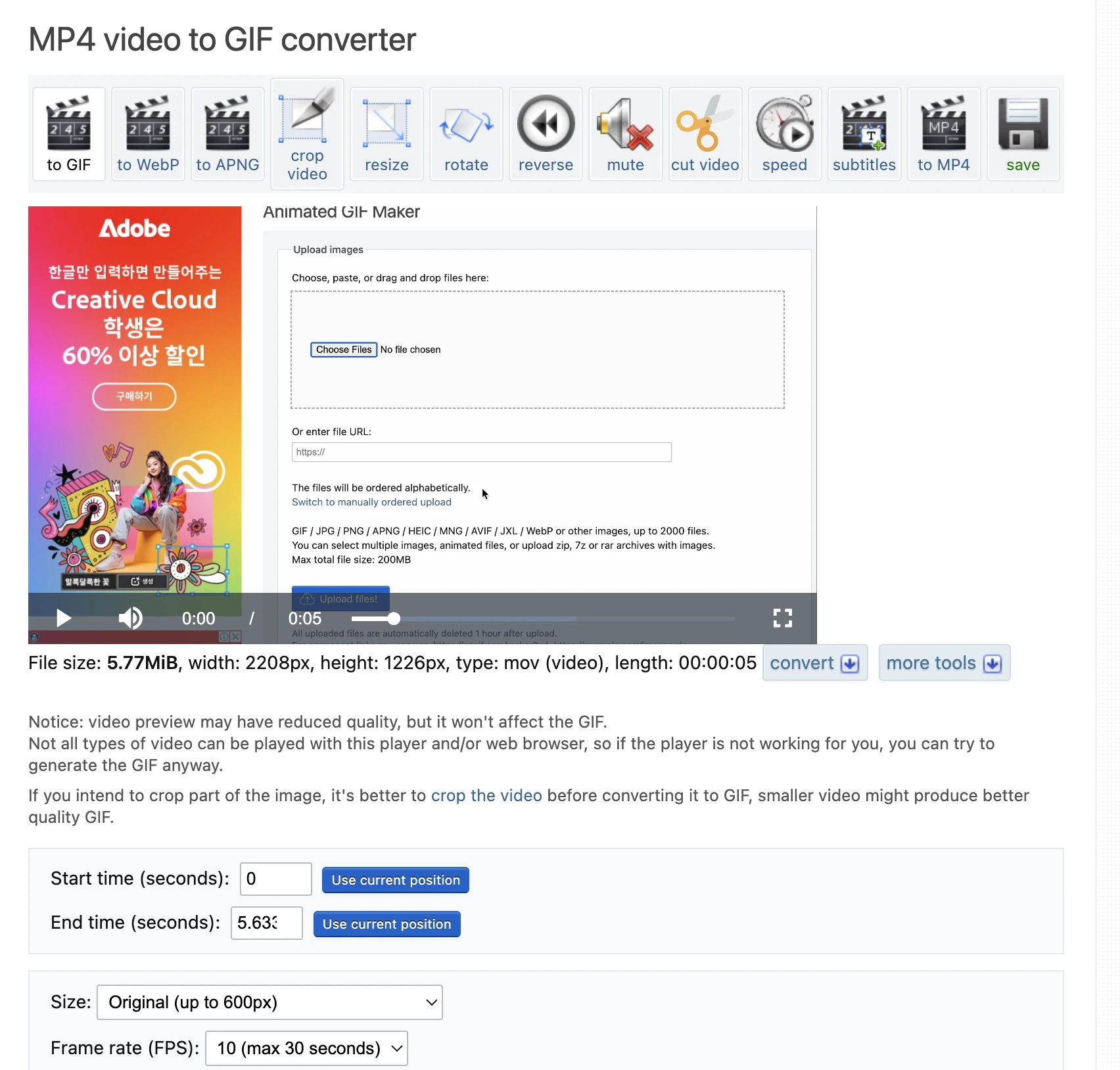 For a simple way to turn a video into a GIF without Canva’s customization options, you can use Ezgif. This lets you upload a video and access basic editing options, such as the ability to adjust the clip’s quality and length.