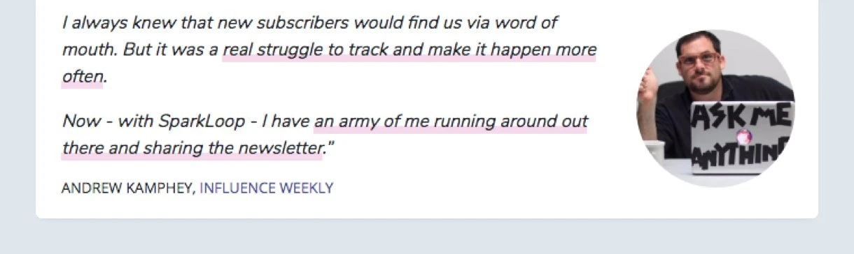 Andrew Kamphey, creator of the Influence Weekly newsletter, does exactly this to great effect. He uses SparkLoop to track which of his existing subscribers have referred a lot of new people to his email list.
