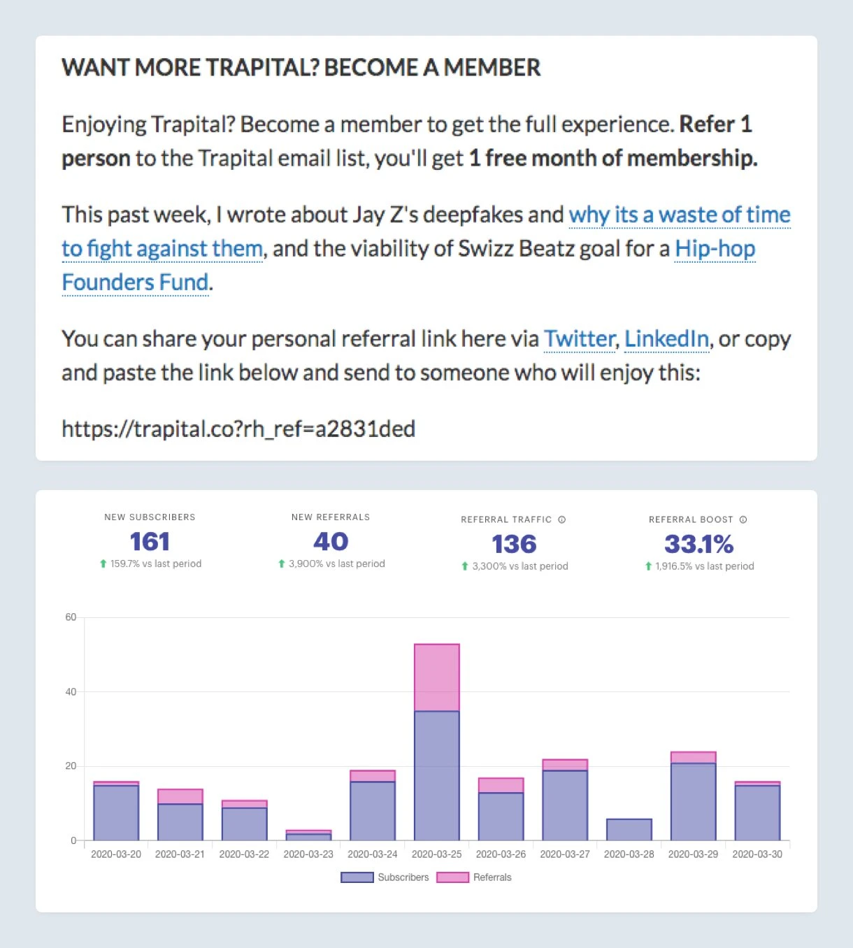 Dan at Trapital did exactly this by offering a free trial month to his paid membership in return for referrals.