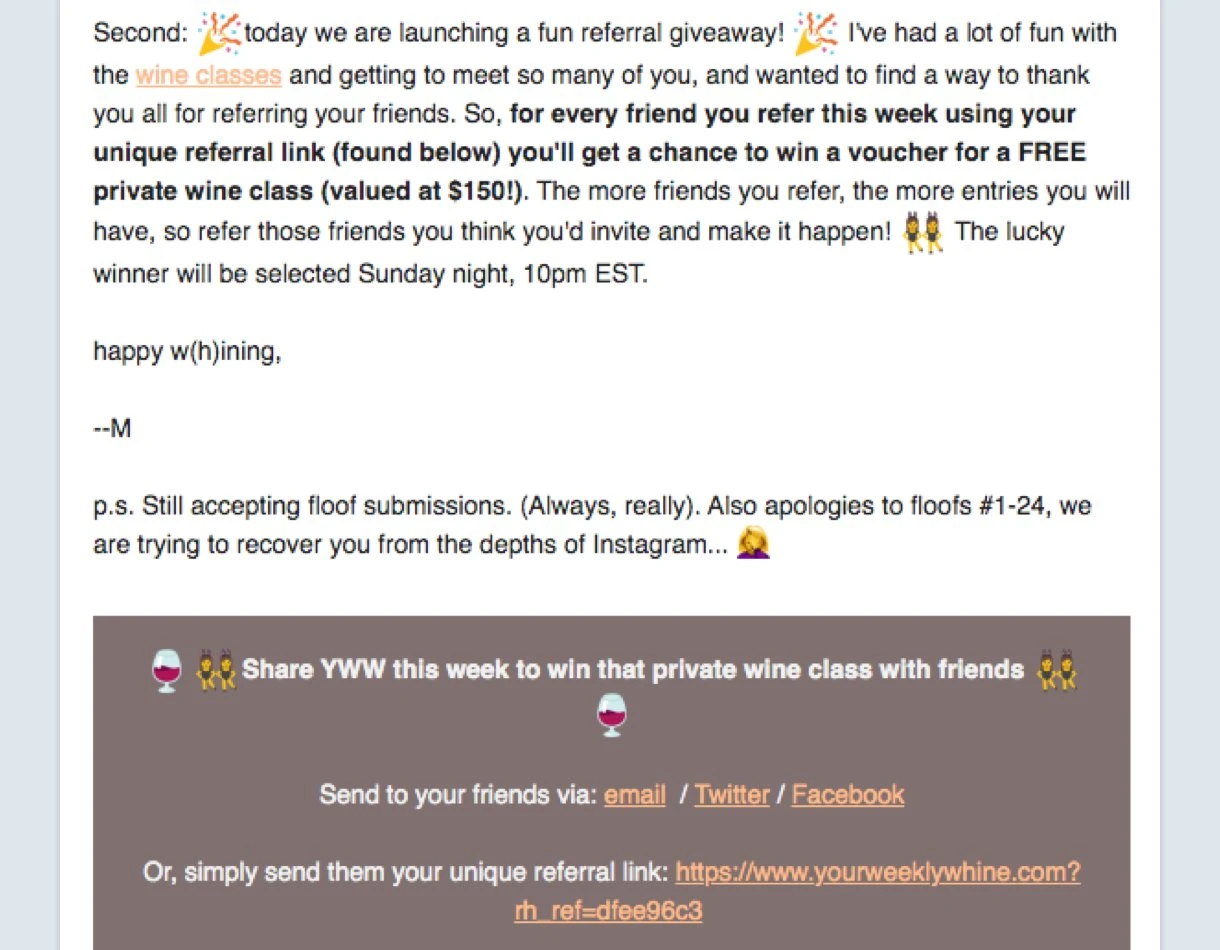 Madison Mellish, the creator of Your Weekly Whine, has a clever way to add FOMO and increases word-of-mouth growth for her newsletter.