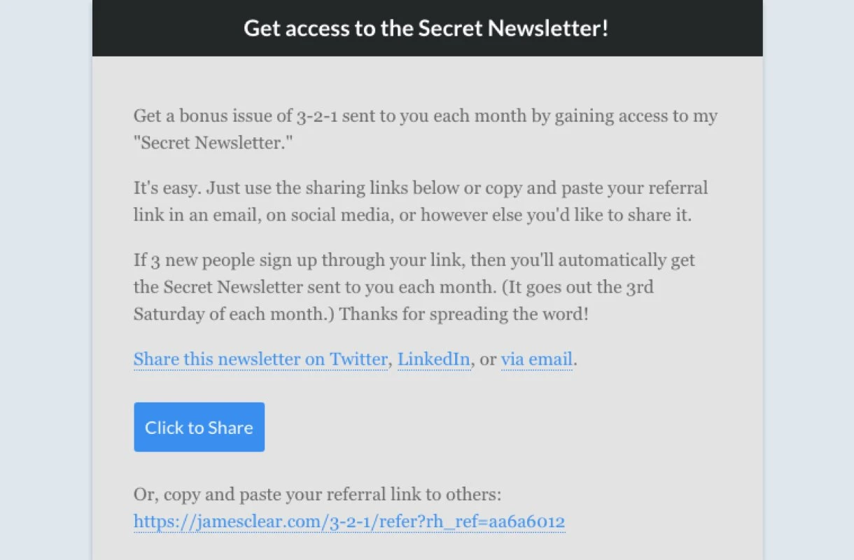 Take NYT-bestselling author James Clear, for example. He rewards his newsletter subscribers with access to a secret monthly newsletter. All they have to do is refer to three people.