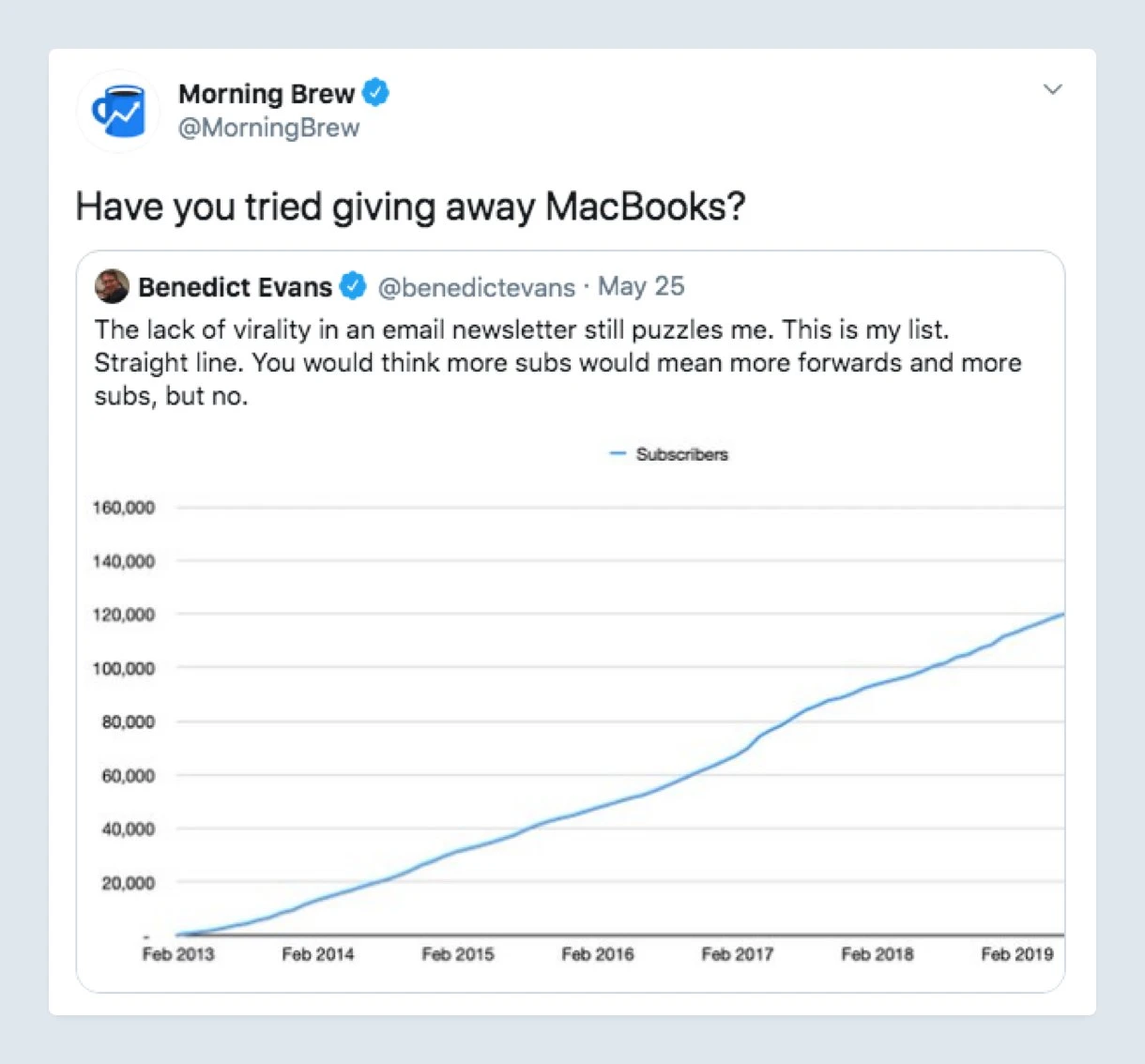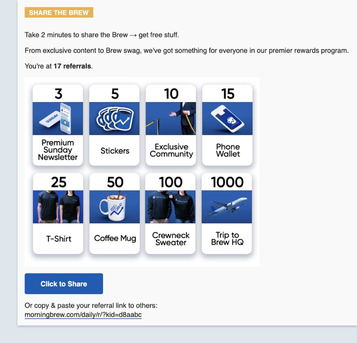 Now, not everyone has the right audience to set up a fancy referral program. Like Morning Brew, with their multiple reward tiers and physical rewards.