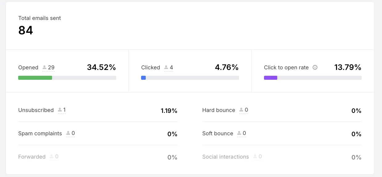 You can also compare your campaigns to those from others in your industry. We analysed data from over 3 million campaigns sent via MailerLite and found that the benchmark open and click rate is 42.35% and 2%, respectively.
