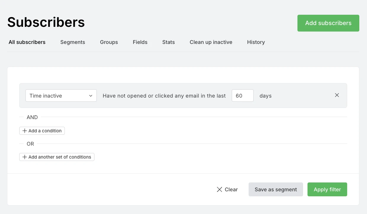 Find your unengaged subscribers by heading to the Subscribers section of your MailerLite dashboard and then using the Time inactive filter to find subscribers who haven’t opened or clicked on your emails in your chosen period.