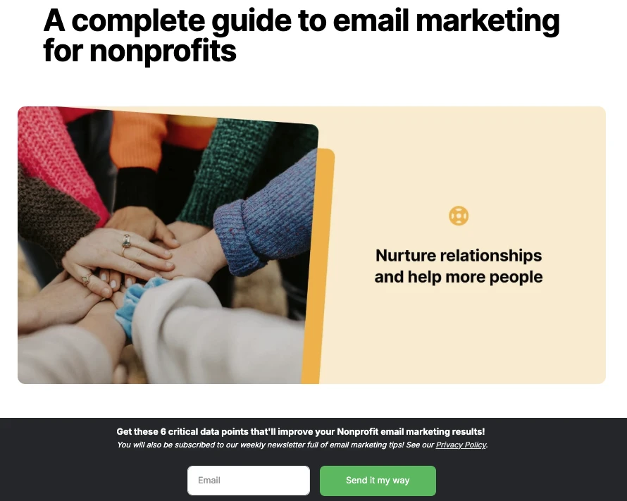 You can then create more targeted resources for different types of leads or customers. At MailerLite, we have resources for e-commerce stores, non-profits, education companies, and more. See an example for non-profits below.